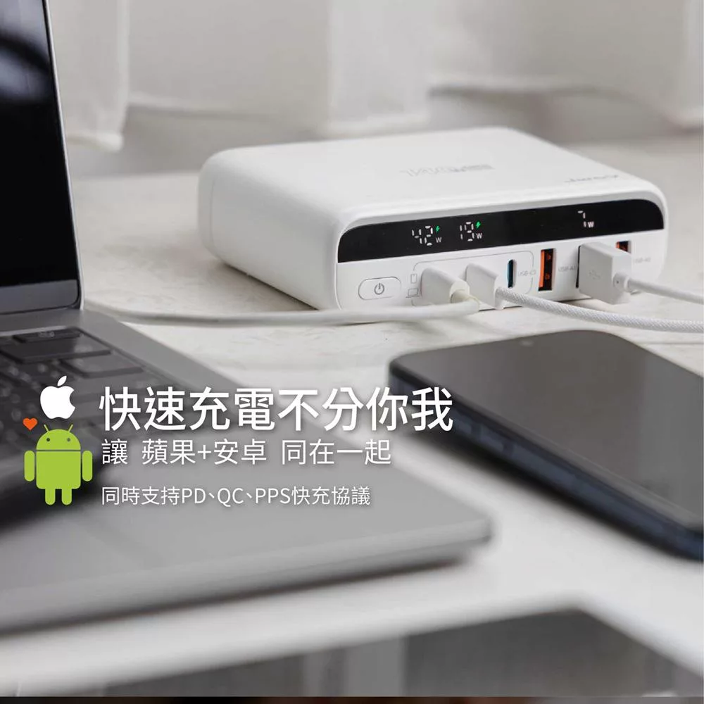 All in one PD65W氮化鎵GaN PTP高溫斷電 按壓式3開4插 USB延長線 110V專用 極致白