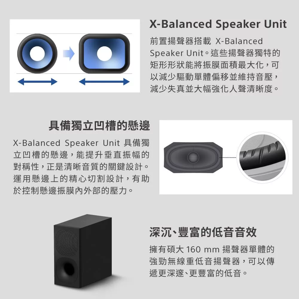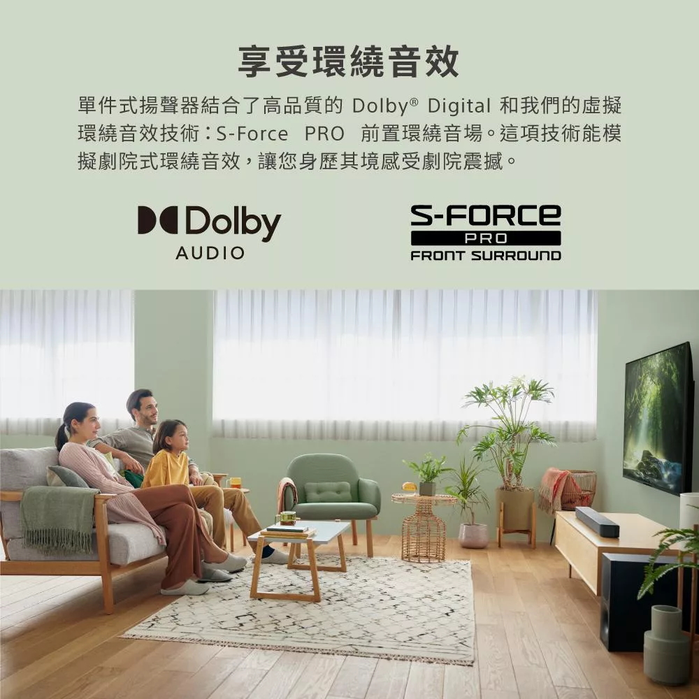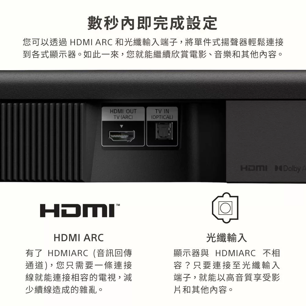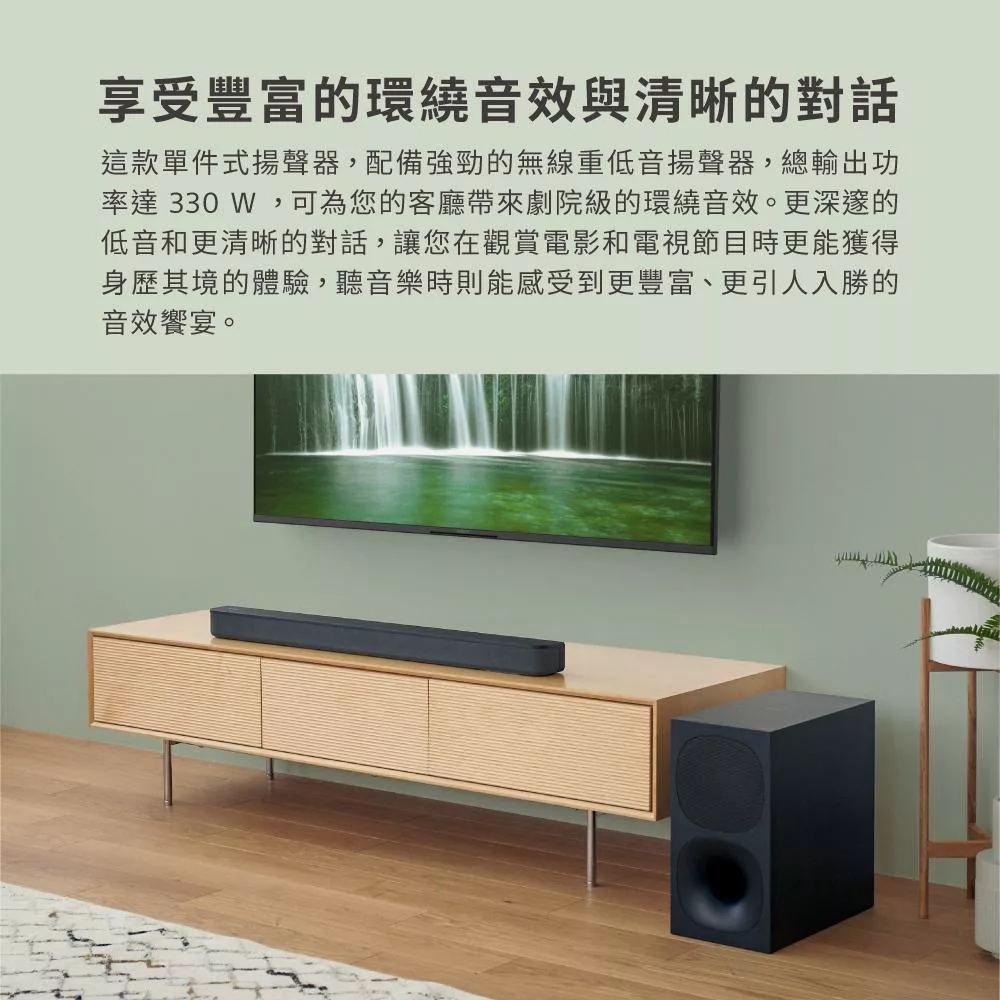 前置環繞聲場劇院級音效 330W 總輸出功率 HDMI ARC、光纖輕鬆連接