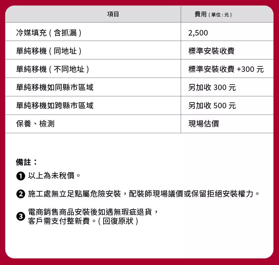*其它:請先提前確認好商品位置及安裝路線,若有非基本安裝之費用,依現場師傅評估報價收費