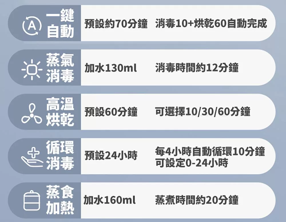 2.「自動」功能:一鍵完成消毒烘乾程序,加水130CC消毒時間約12分鐘,預設烘乾60分鐘。
