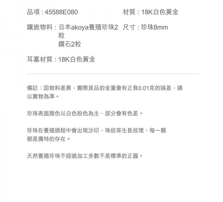 ●鑲嵌物料:日本Akoya養殖珍珠(東珠)/鑽石