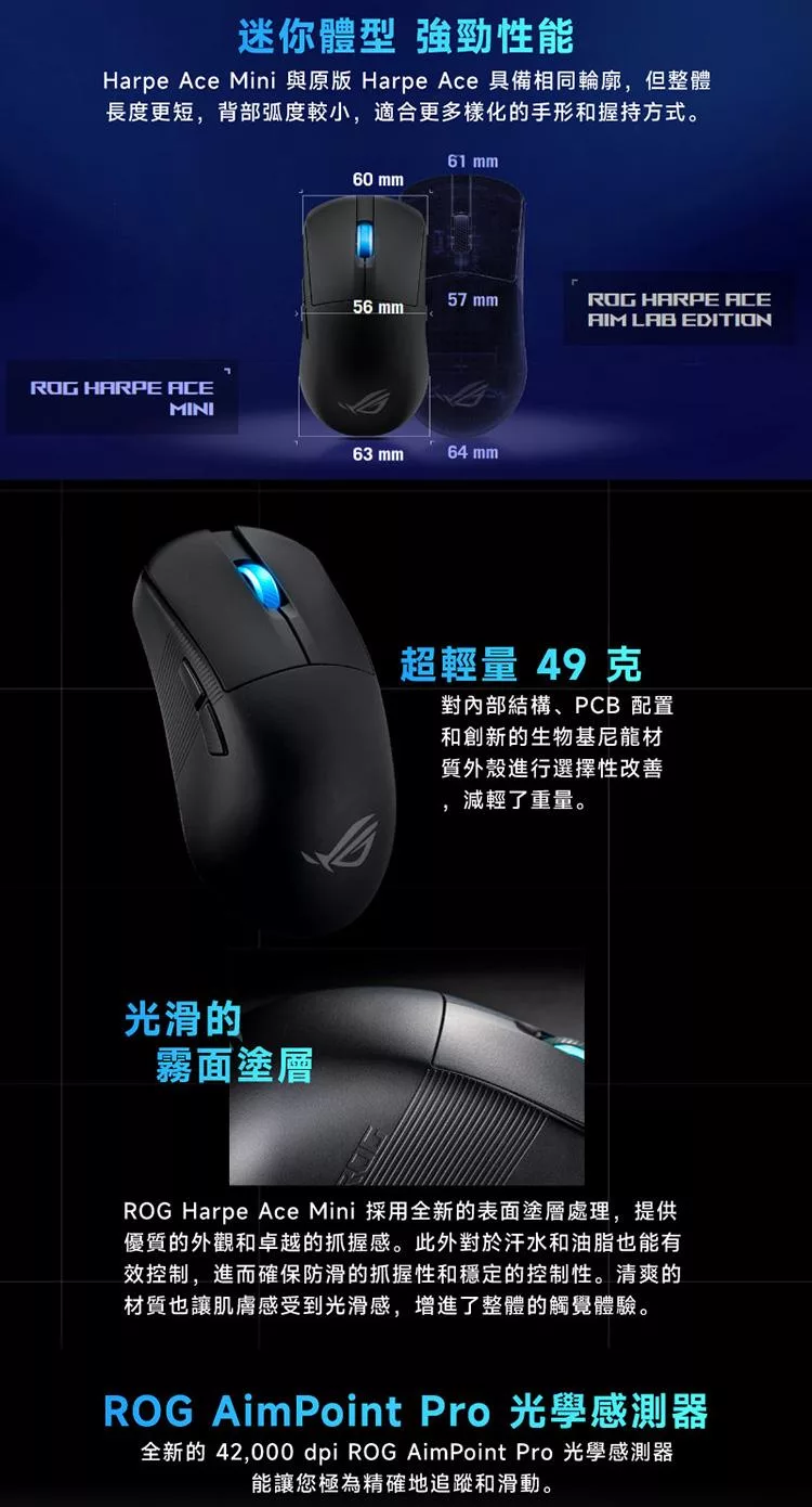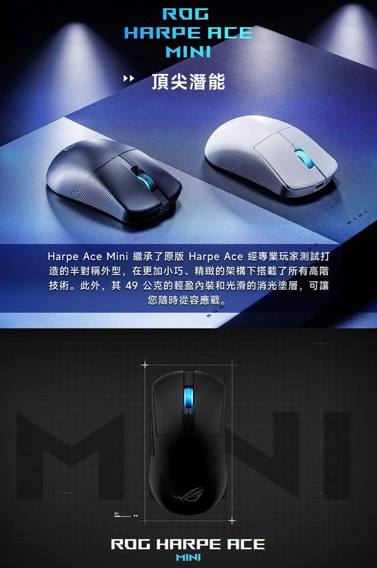 【送原廠ROG電競鼠墊】ASUS 華碩 ROG Harpe Ace Mini 半對稱電競滑鼠 黑色