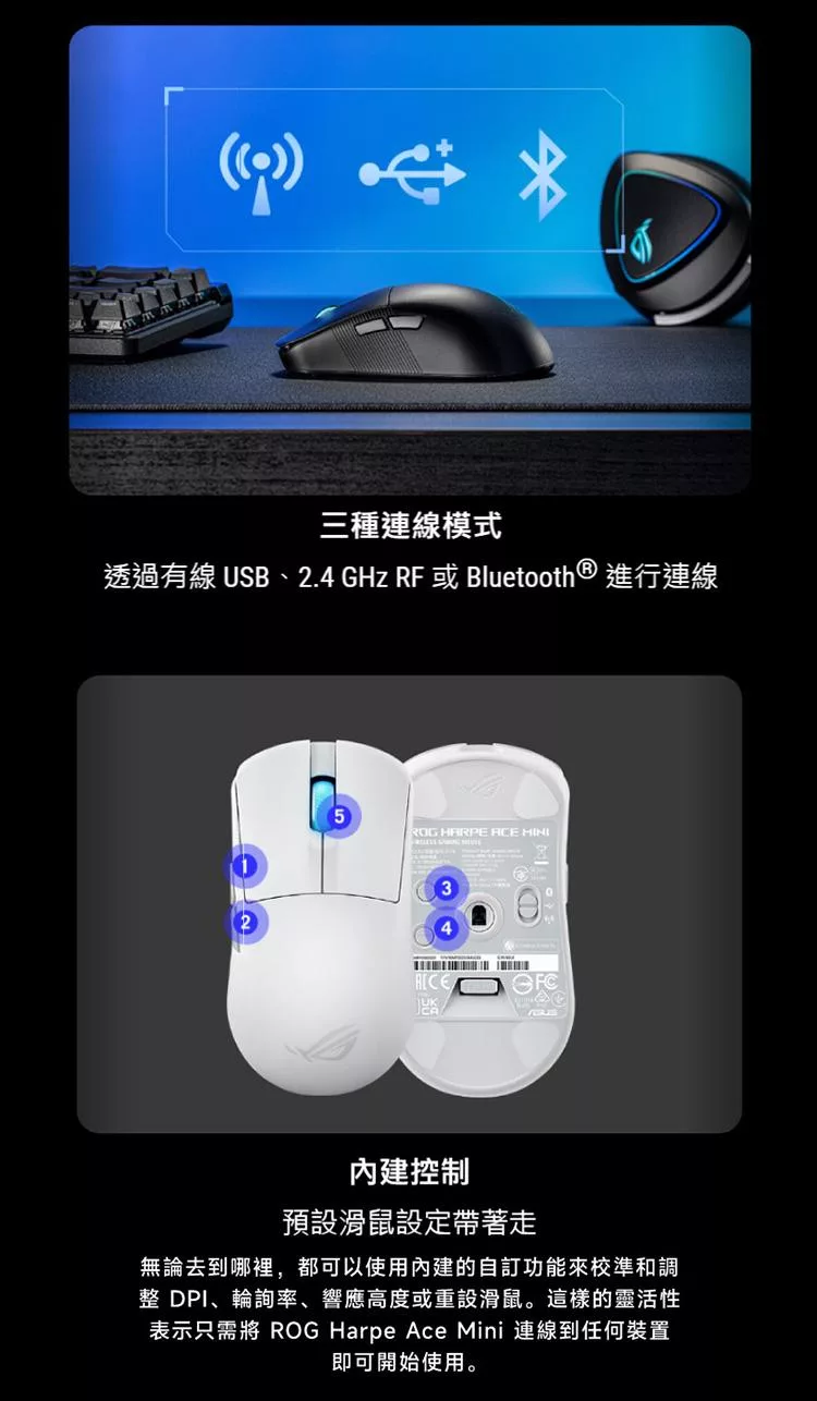 【送原廠電競鼠墊】ASUS 華碩 ROG Harpe II Ace 無線三模電競滑鼠 白色