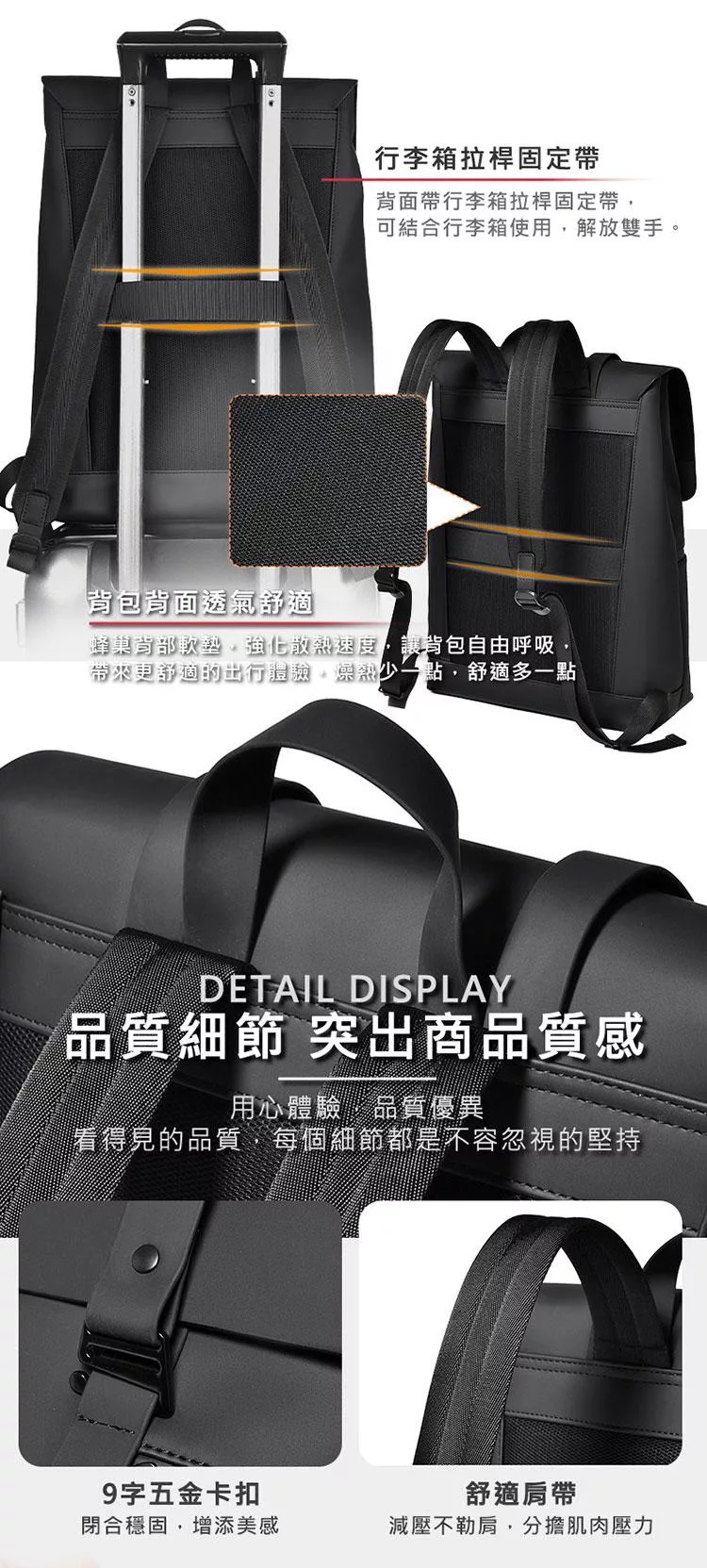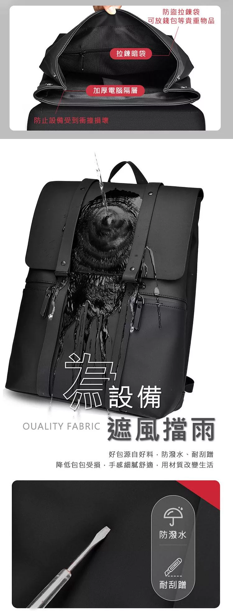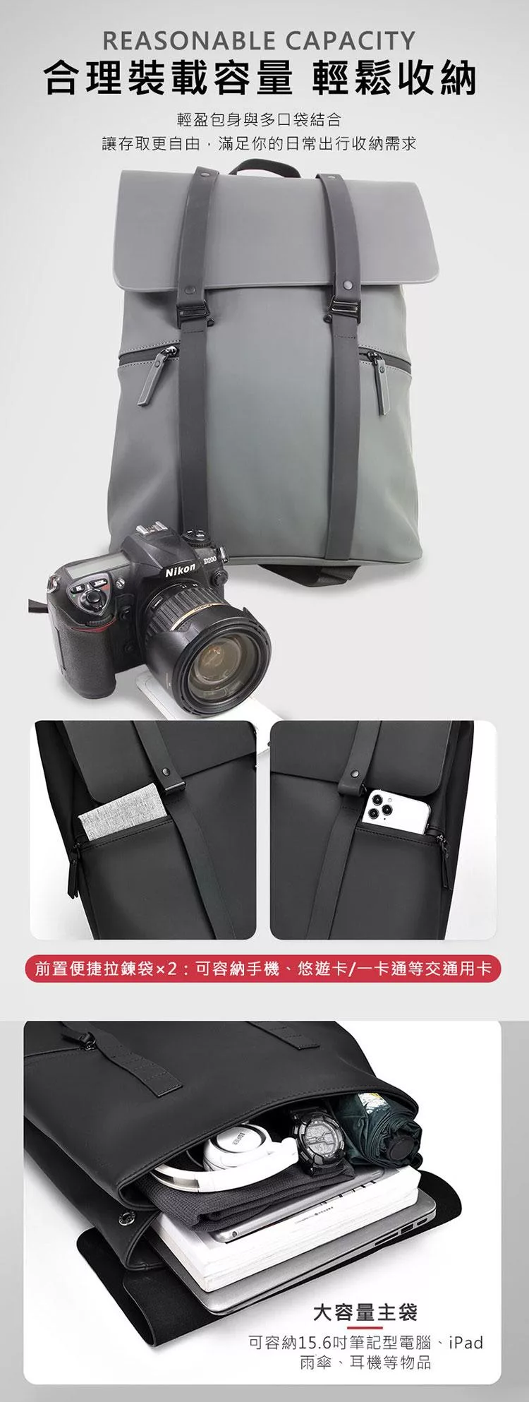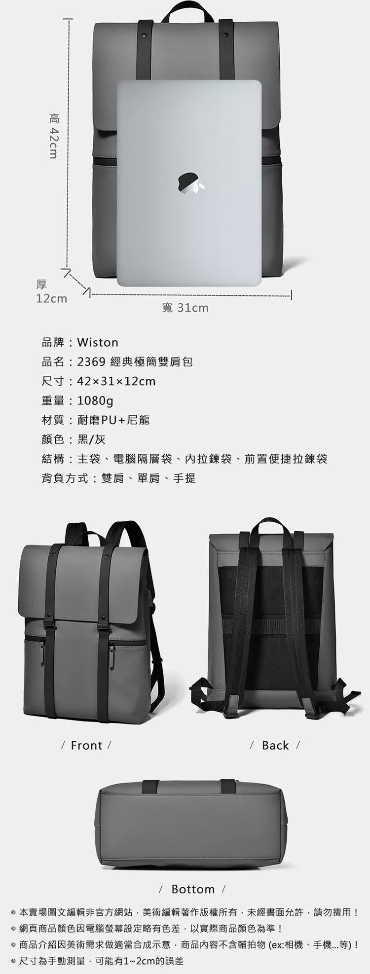 結構:主袋、電腦隔層袋、內拉鍊袋、前置便捷拉鍊袋