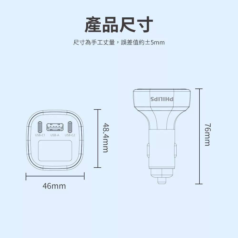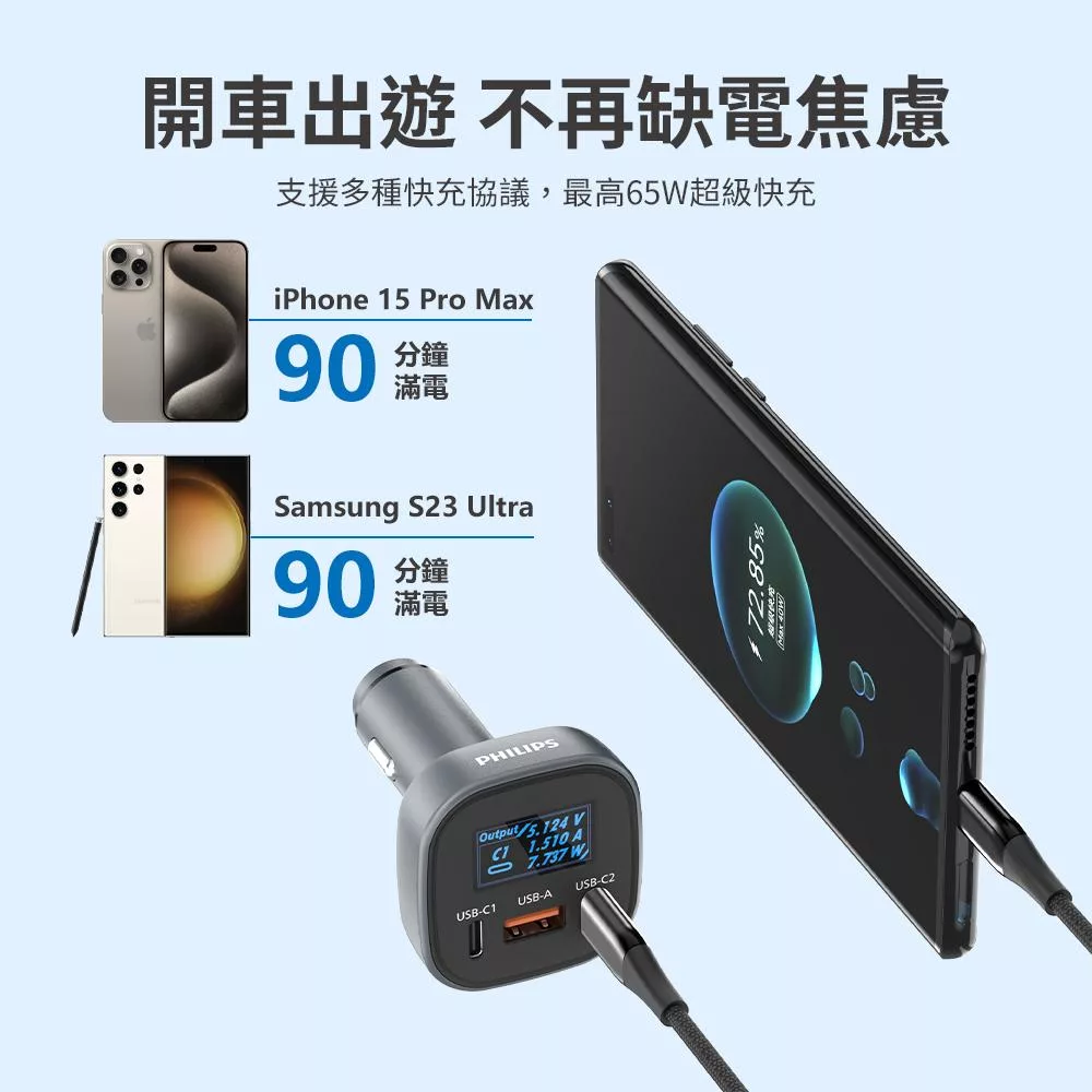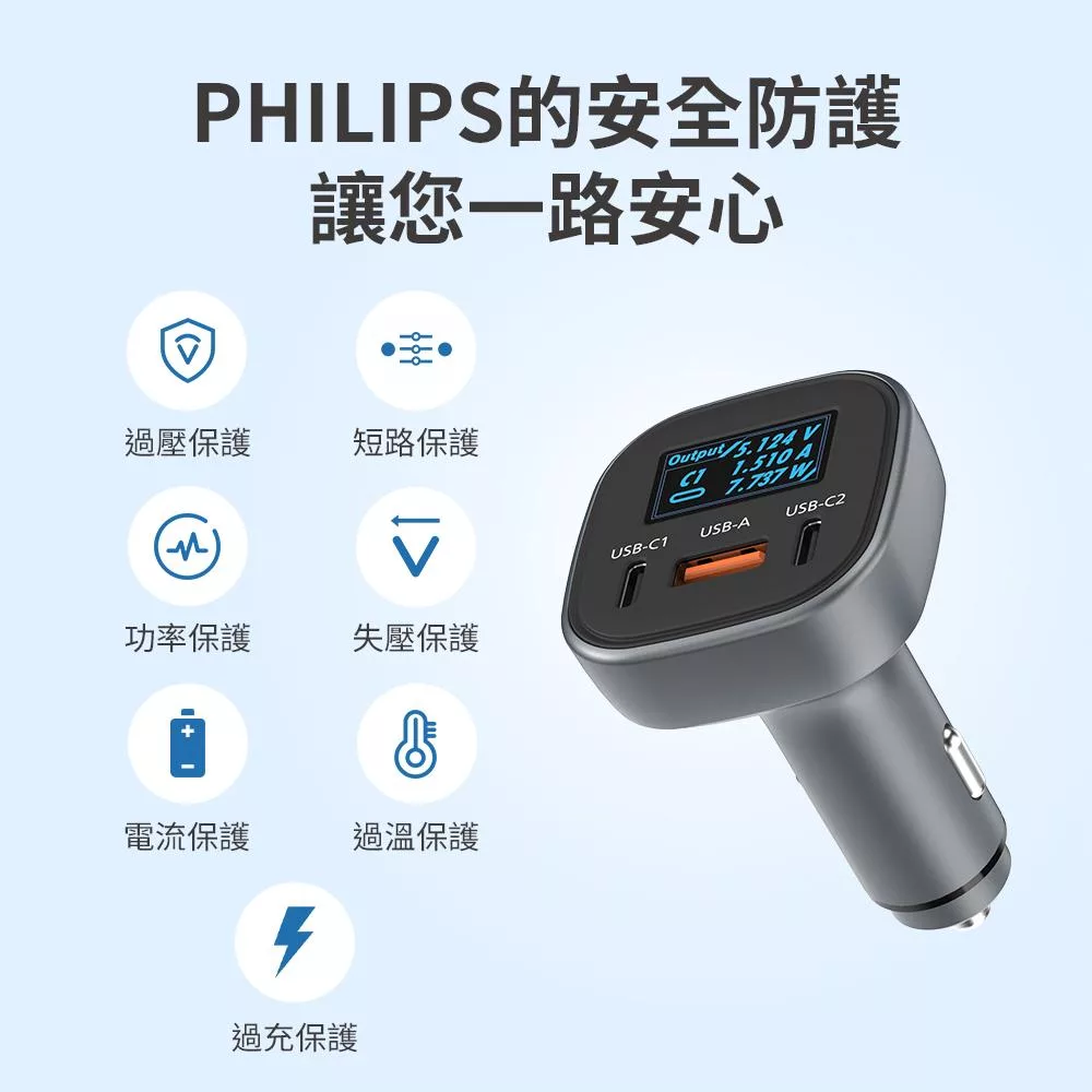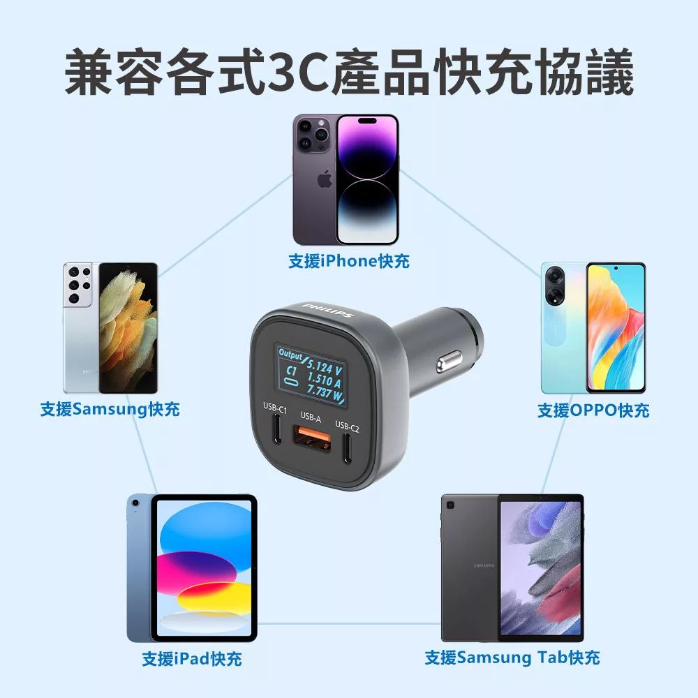 飛利浦 黑金剛 PD 100W 快充 Type-C Type-A 3孔 數位顯示 車用 充電器