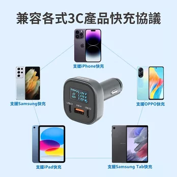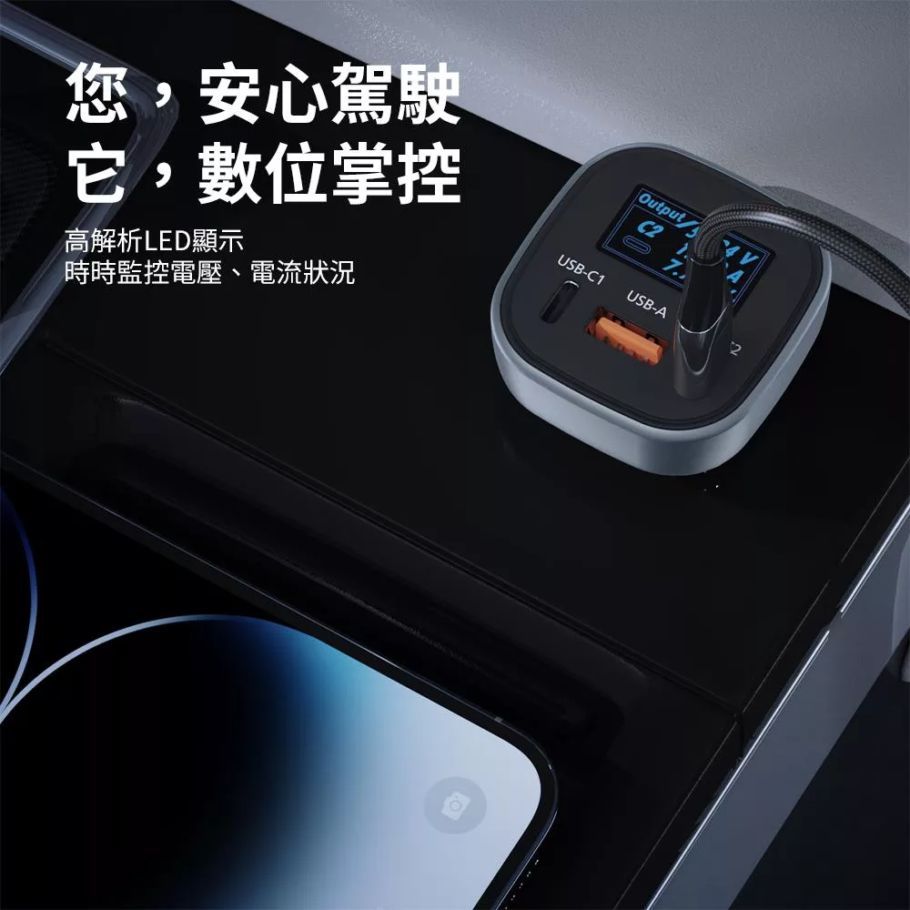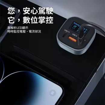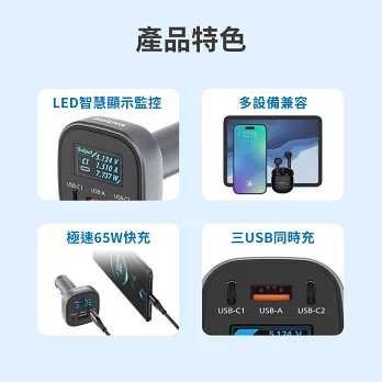 | 數位顯示車用充電器 LED智慧顯示監控 多設備兼容 單口USB-C極速65W快充,Android、iPhone均可快充 三口USB同時充 多重安全防護 : 過壓保護、短路保護、功率保護、施壓保護、電流保護、過溫保護、過充保護 車款相容 : 支援市面上大多數車款 |