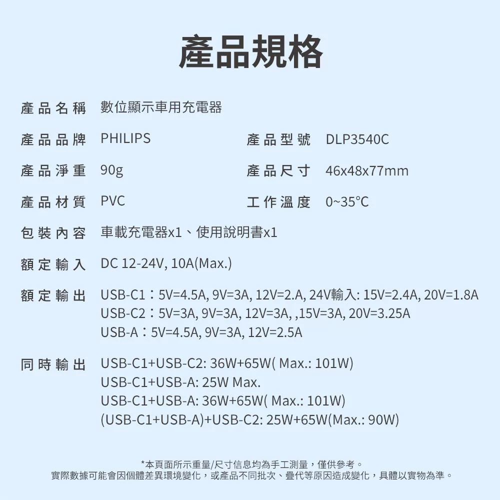 | 額定输入 : DC 12-24V,10A(Max.) USB-C1输出 : 5V=4.5A, 9V=3A,12V=2.5A24V翰入:15V=2.4A,20V= 1.8A USB-C2输出 : 5V-3A,9V-3A,12V-3A,15V=3A,20V-3.25A USB-A输出 : 5V=4.5A,9V-3A,12V-2.5A 同時翰出 : USB-C1+USB-C2:36W+65W( Max.: 101W) USB-C1+USB-A: 25W Max. USB-C2+USB-A: 65W+36W( Max.:101W) (USB-C1+USB-A)+USB-C2: 25W+65W(Max.: 90W) 工作溫度 : 0~35℃ |
