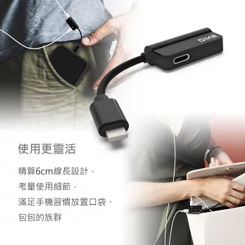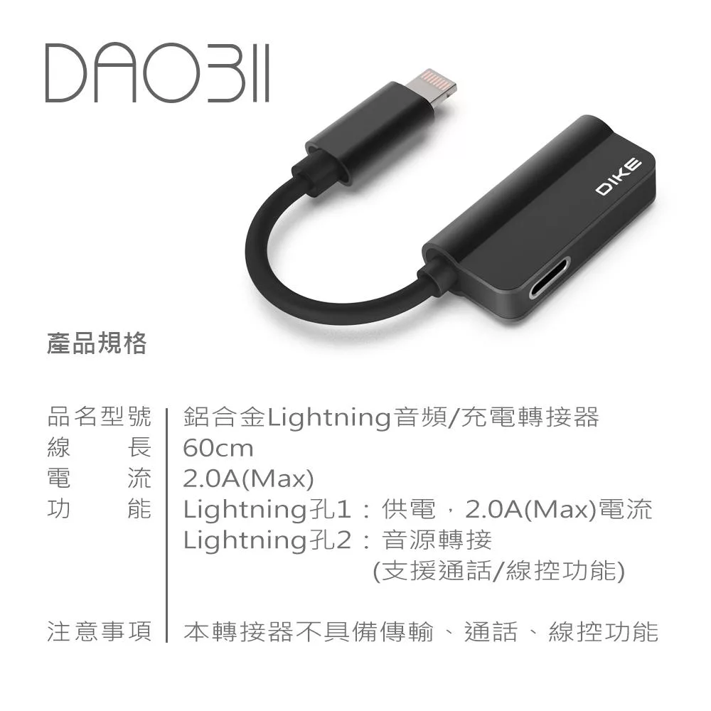 | 電流 2.0A(Max) 線長 60mm 功能 Lightning孔:供電,2.0A(Max)電流 3.5mm孔 :音源轉接(無通話功能)" 注意事項 本轉接器不具備傳輸、通話、線控功能 |