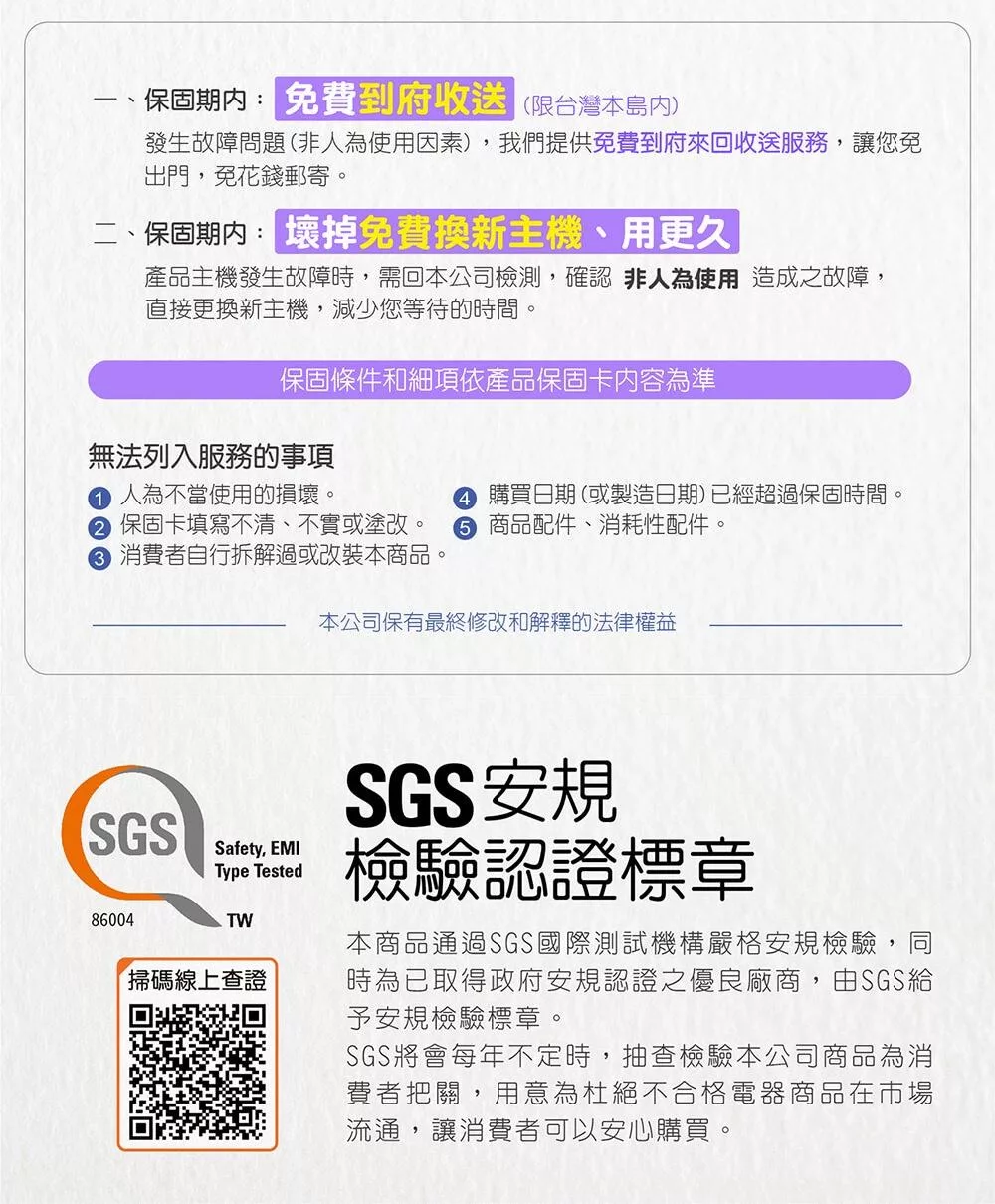 家電或3C商品涉及技術及專業,其保固及維修相關事宜仍應由該商品之原廠、代理商、製造商等進行專業之處置。若商品有保固及維修之需求,請依循原廠、代理商、製造商揭示之相應規範及流程處置,並配合提供產品序號和購買證明後依其指示進行。以商品瑕疵為由退換貨者,可代為受理將商品送原廠或代理商檢測(一般處理時間需2~3週,實際依各該品牌規範為準),若經檢測非商品本身瑕疵,恐無法退換貨。