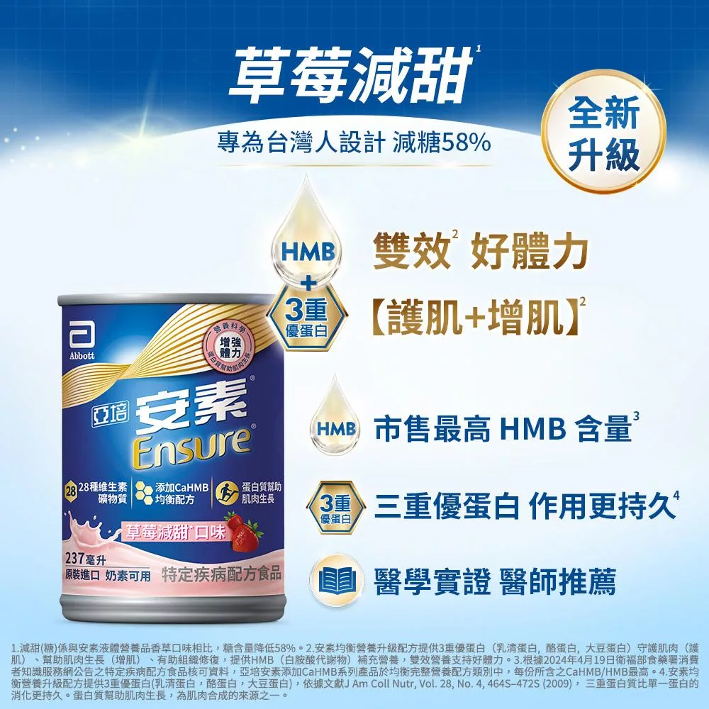 亞培 安素草莓減甜 HMB升級配方237ml -2箱共48入