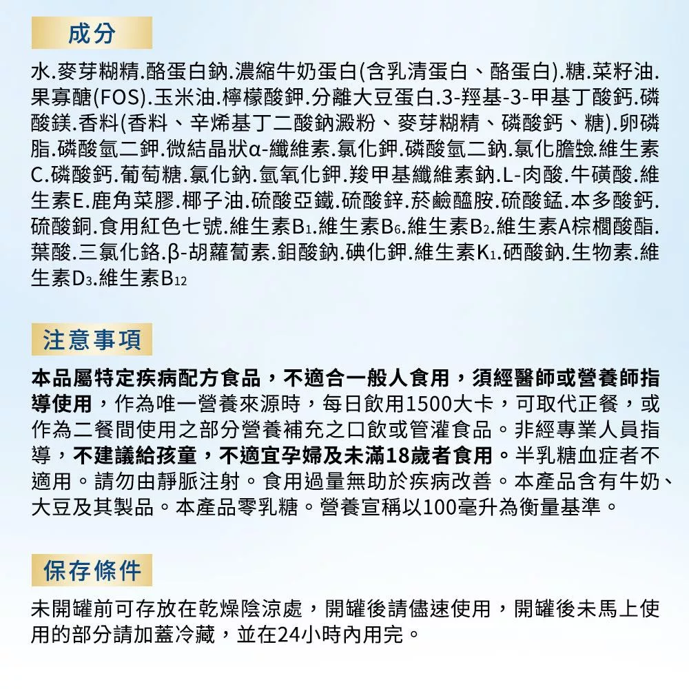 除非經醫師或合格的醫療專業人員指示,本品不建議給孩童使用。半乳糖血症者不適合食用。請勿由靜脈注射。本品屬特定疾病配方食品,不適合一般人食用,不適宜孕婦及未滿18歲者食用,須經醫師或營養師指導使用,可單獨管灌滿足需要。食用過量無助於疾病改善。本品含有牛奶、大豆及其製品。