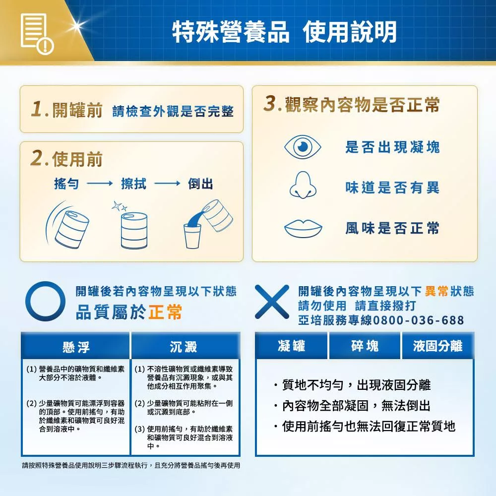 除非經醫師或合格的醫療專業人員指示,本品不建議給孩童使用。半乳糖血症者不適合食用。請勿由靜脈注射。本品屬特定疾病配方食品,不適合一般人食用,不適宜孕婦及未滿18歲者食用,須經醫師或營養師指導使用,可單獨管灌滿足需要。食用過量無助於疾病改善。本品含有牛奶、大豆及其製品。