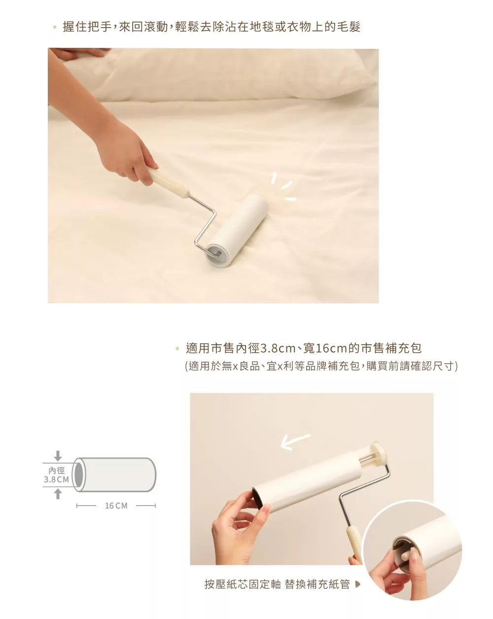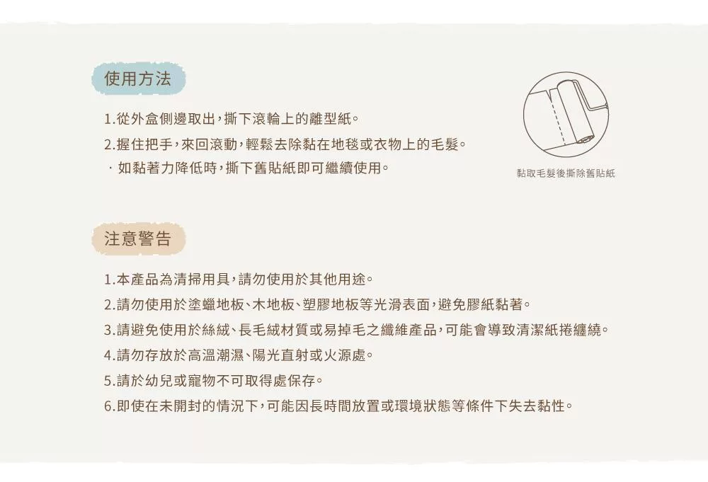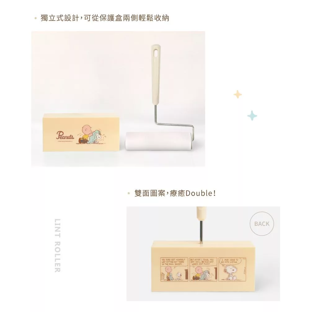獨立式設計,可從保護盒兩側輕鬆收納 握住把手,來回滾動,輕鬆去除沾在地毯或衣物上的毛髮 雙面圖案,療癒Double! 適用市售內徑3.8cm、寬16cm的市售補充包