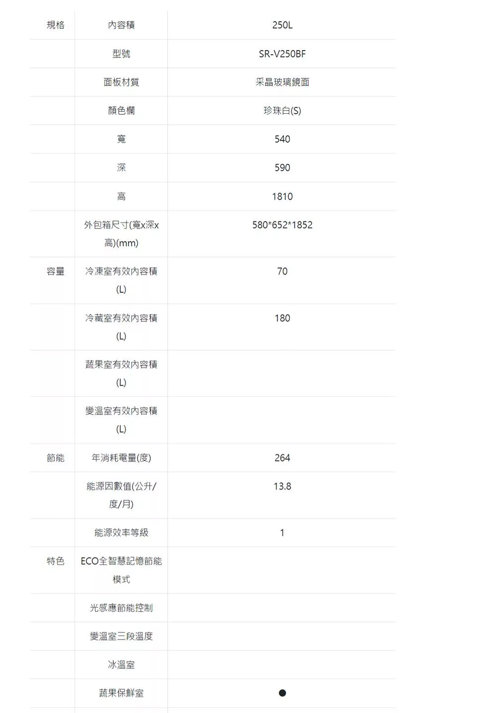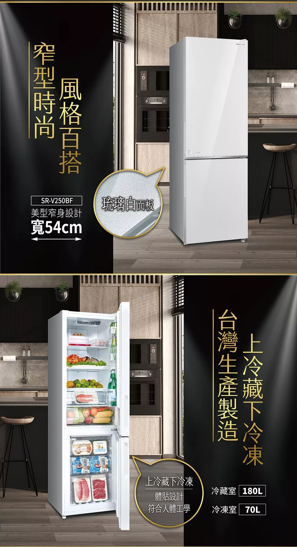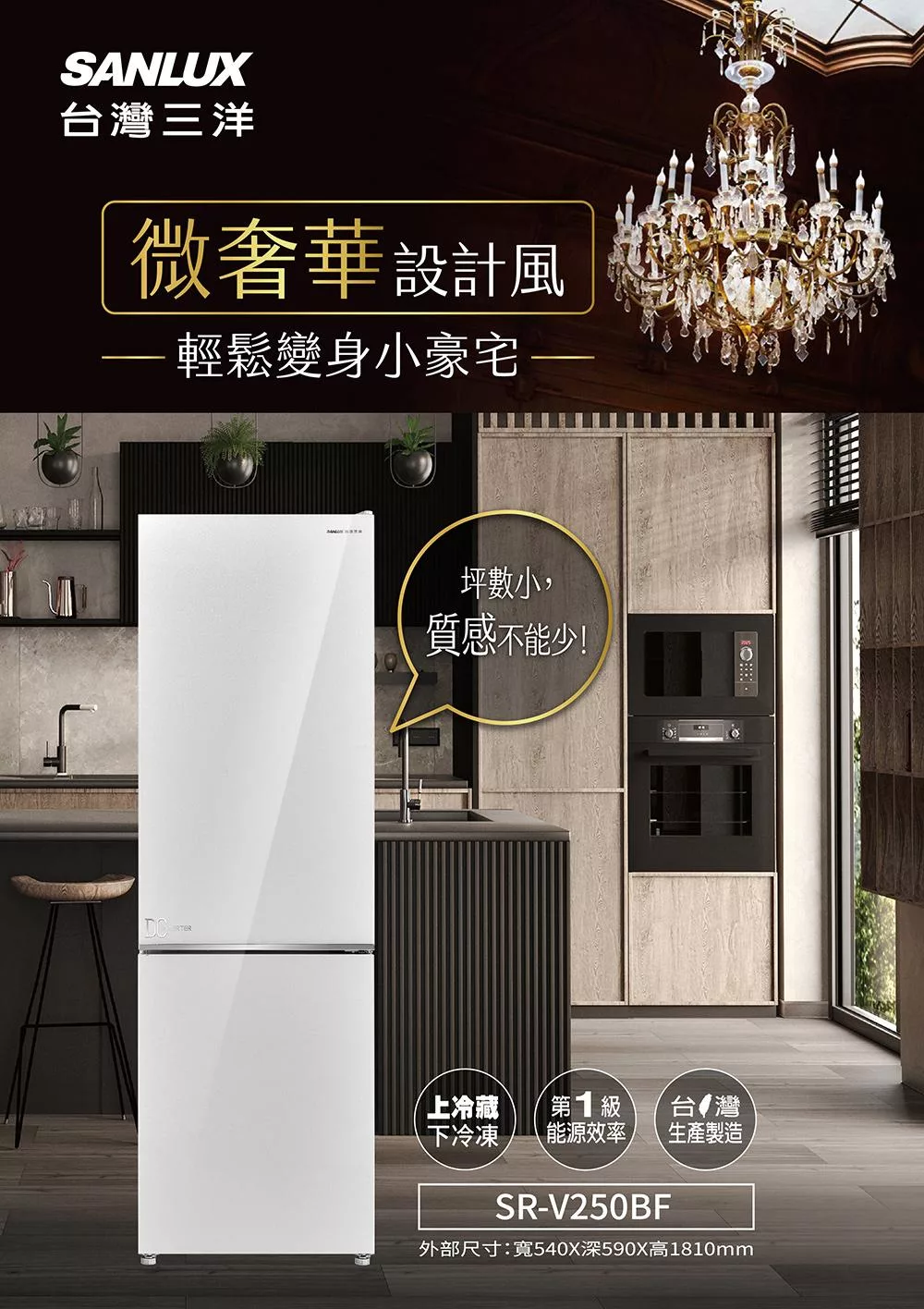 SANLUX 台灣三洋 250公升1級能效雙門玻璃下冷凍變頻冰箱(SR-V250BF上冷藏180L/下冷凍70L)