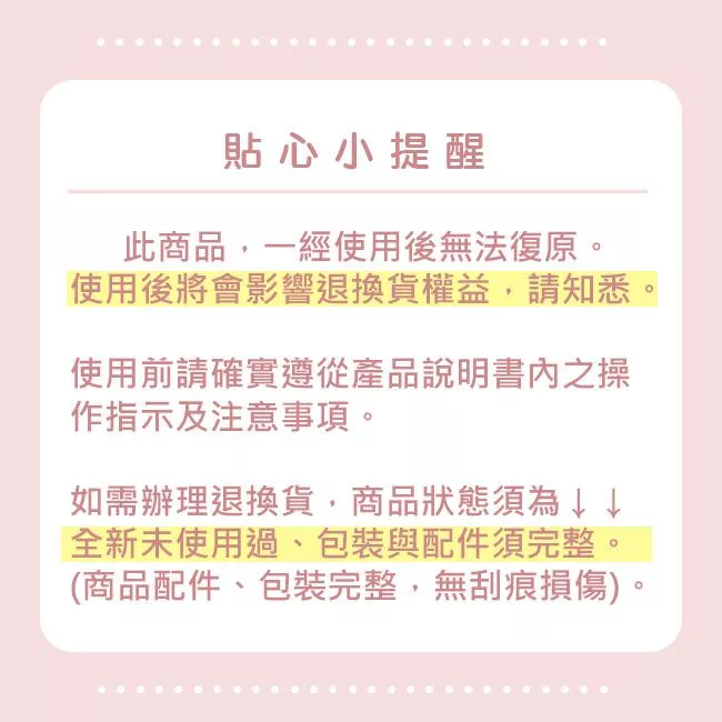 因商品封條多為一次性包裝,商品退貨時必須回復原狀,亦即必須回復至您收到商品時的原始狀態,無法回復原狀者,以及有任何逾越檢查商品必要之破壞包裝行為或測試使用痕跡,恐將影響退貨權益。