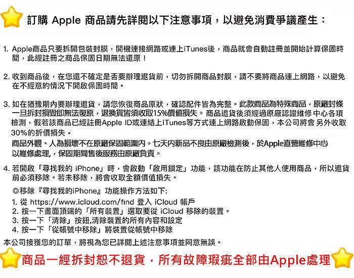 1.APPLE商品為特殊性3C商品,經連線註冊(含開機及啟動wifi)登入APPLE ID或連上iTunes後,該商品即被註冊,且開始計算商品保固時間,經註冊商品無法還原,若申請退換貨,則需另收商品整新費用。