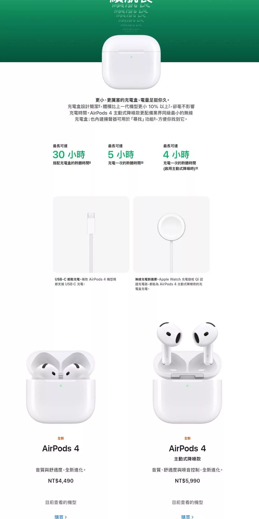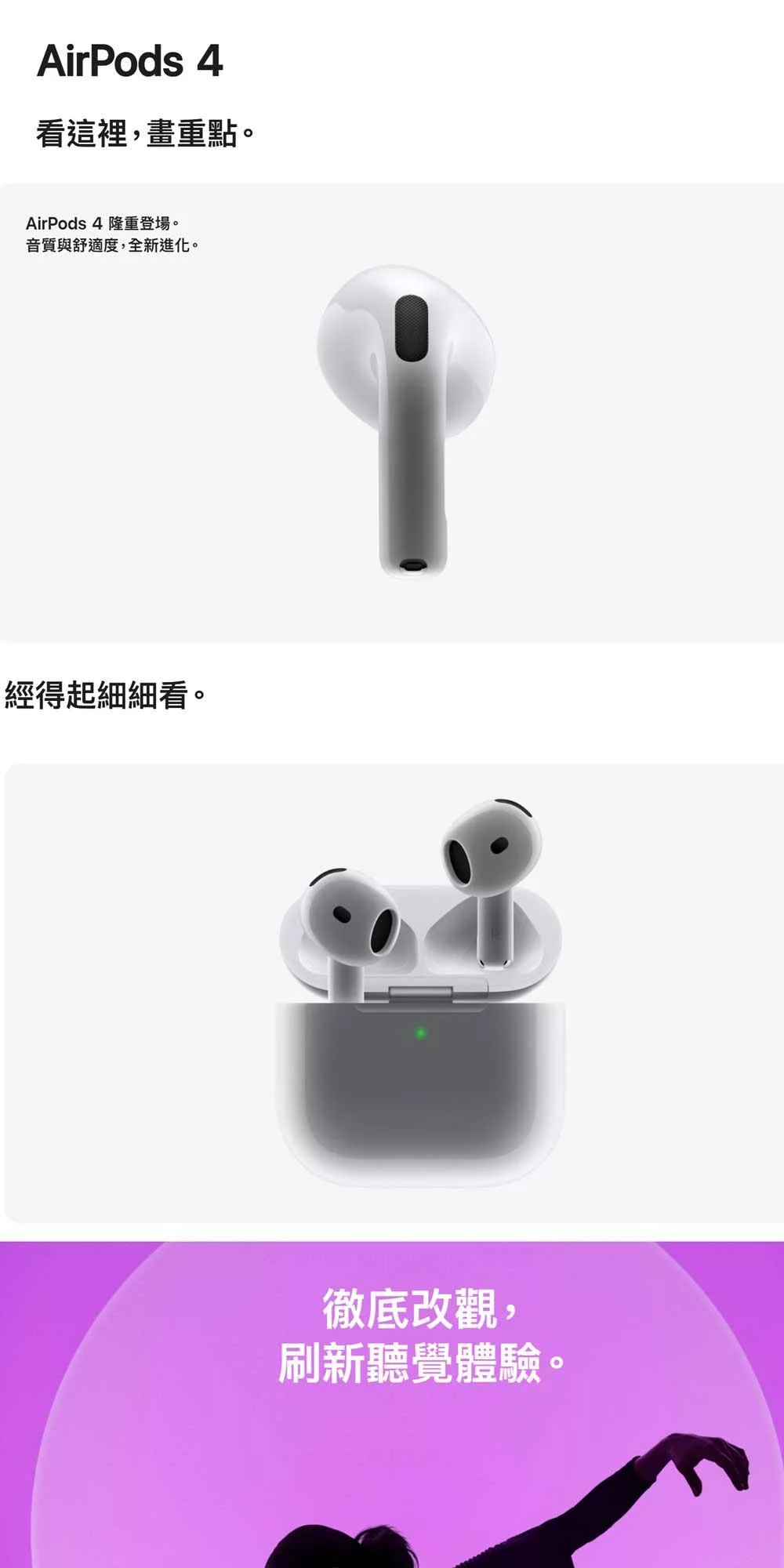 商品內容物:AirPods 4 主動式降噪款、充電盒 (USB-C) 配備揚聲器、說明文件