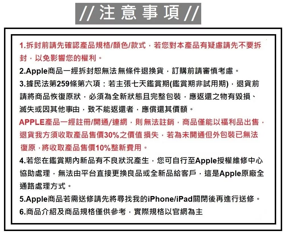 2.商品開箱後若有瑕疵 / 不良,需由消費者帶至授權中心進行維修流程,需依 APPLE 原廠規範判定後提供更換或是維修處置。