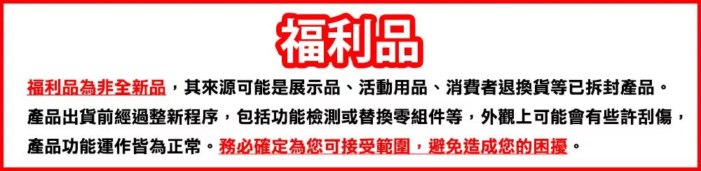 商品必須是全新狀態與完整包裝(請注意保持商品本體、配件、贈品、保證書、原廠包裝及所有附隨文件或資料的完整性,切勿缺漏任何配件或損毀原廠外盒),否則將可能視回收的商品及包裝之破壞狀態(如損傷、缺件、不當使用) 計算商品價值之損失,酌收額外的回復原狀費用,請您務必確認有購買需求後再行拆封,感謝您的配合。
