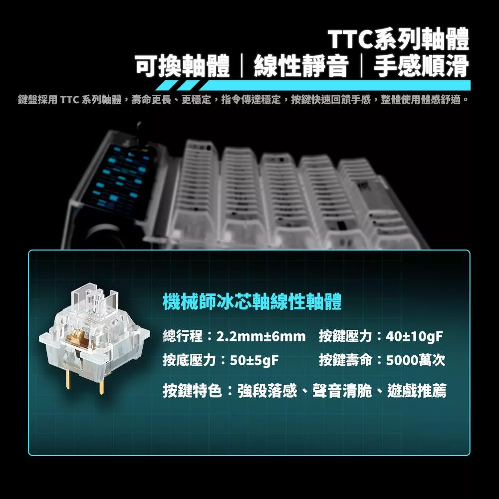 ABS注塑半透明TTC散熱靜音冰芯軸,壽命更長、更穩定,指令傳達穩定,按鍵快速回饋手感,整體使用體感相當舒適。