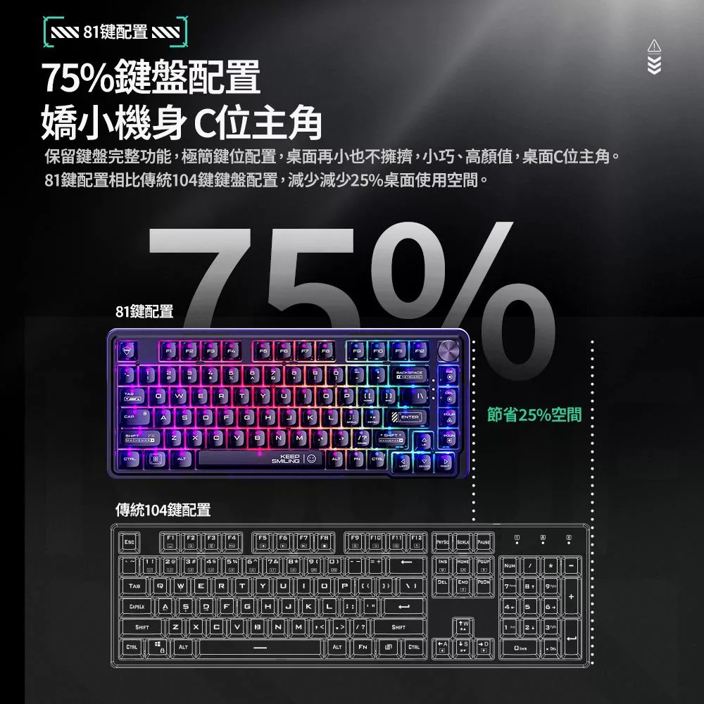 保留鍵盤完整功能,極簡鍵位配置,桌面再小也不擁擠,小巧機身、高顏值,桌面C位主角。81鍵配置相比傳統104鍵鍵盤配置,減少減少25%桌面使用空間。
