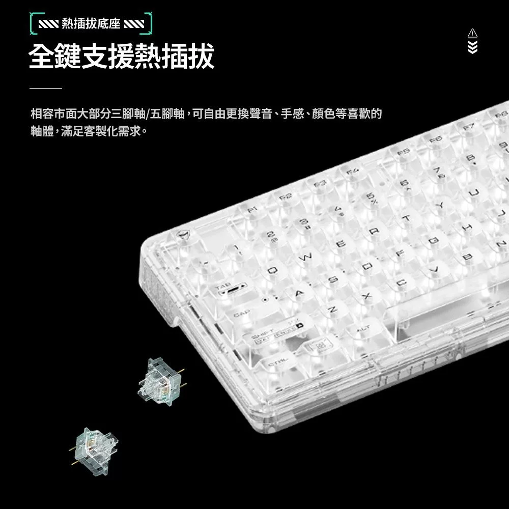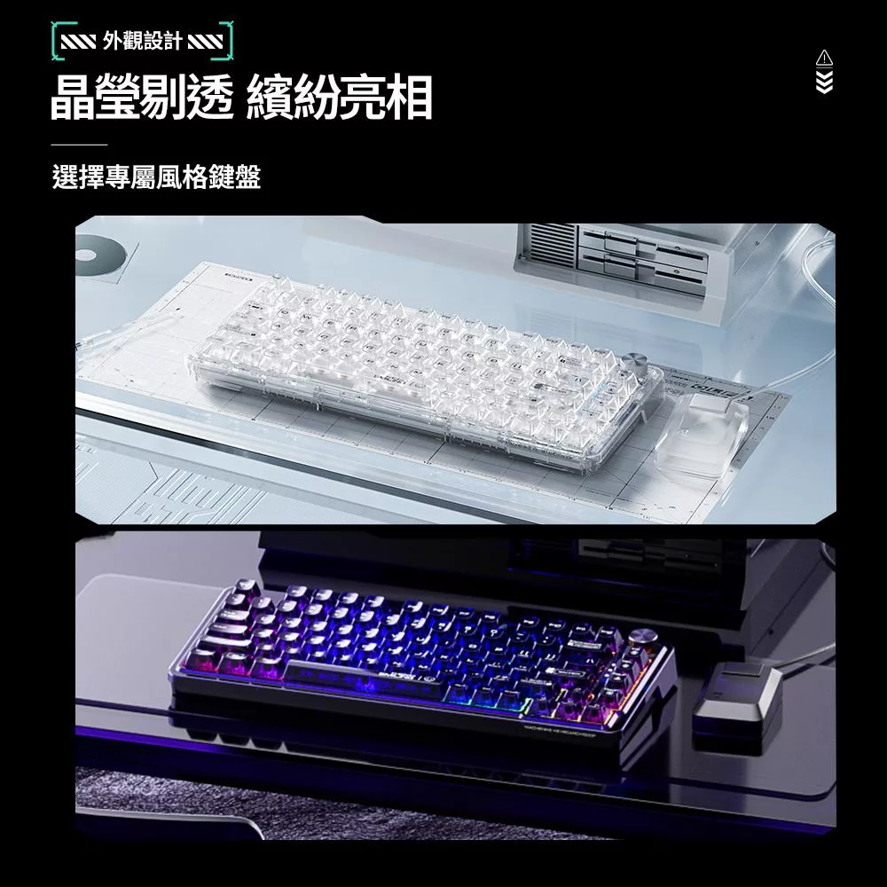 PC 晶透鍵帽,結合 ABS 透明機身,通晶透體。配合RGB燈光效果,透過冰瑩軸體,靈動散射、營造電競遊戲使用情境感。
