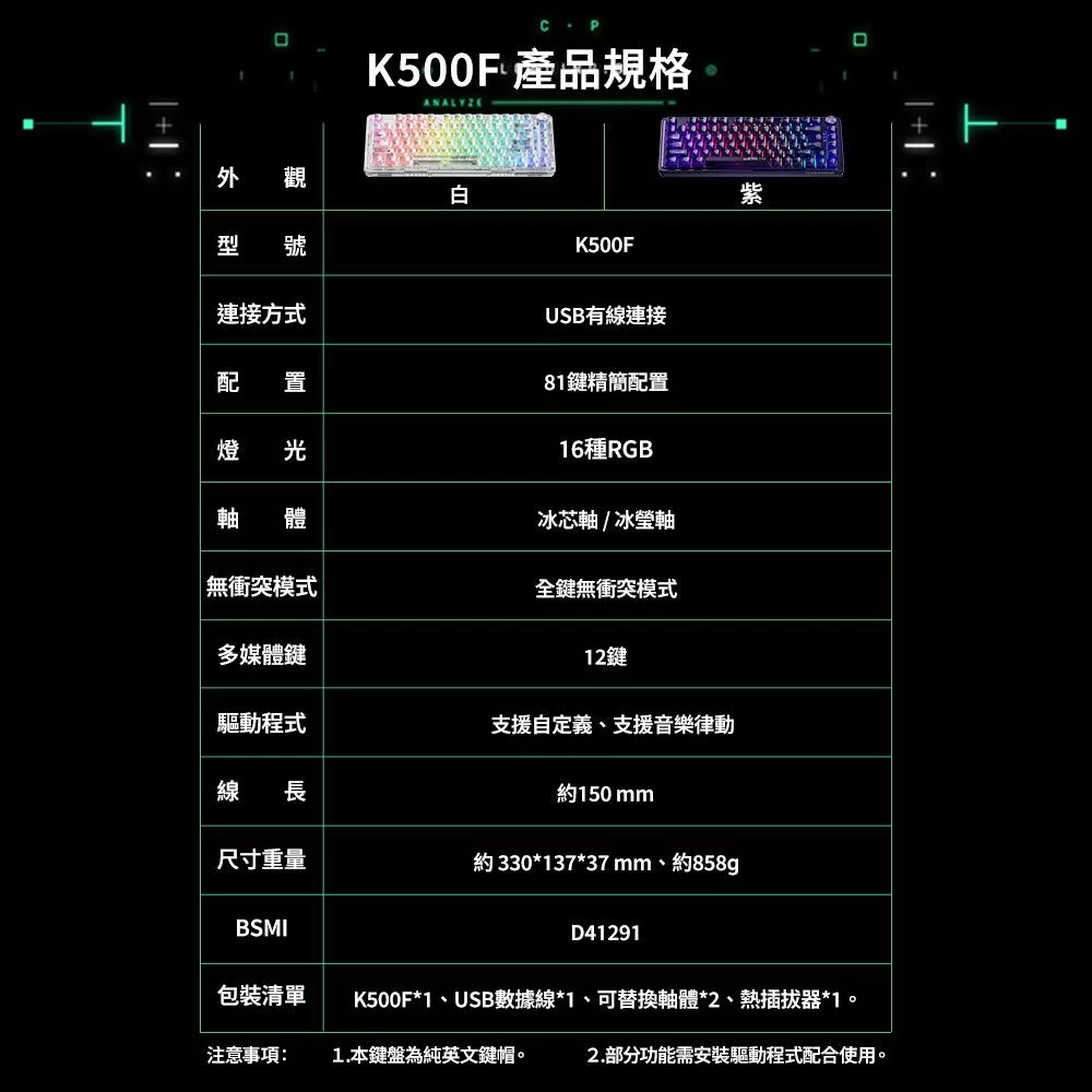 1.本產品內容物僅包含K500F*1、USB數據線*1、可替換軸體*2、熱插拔器*1。