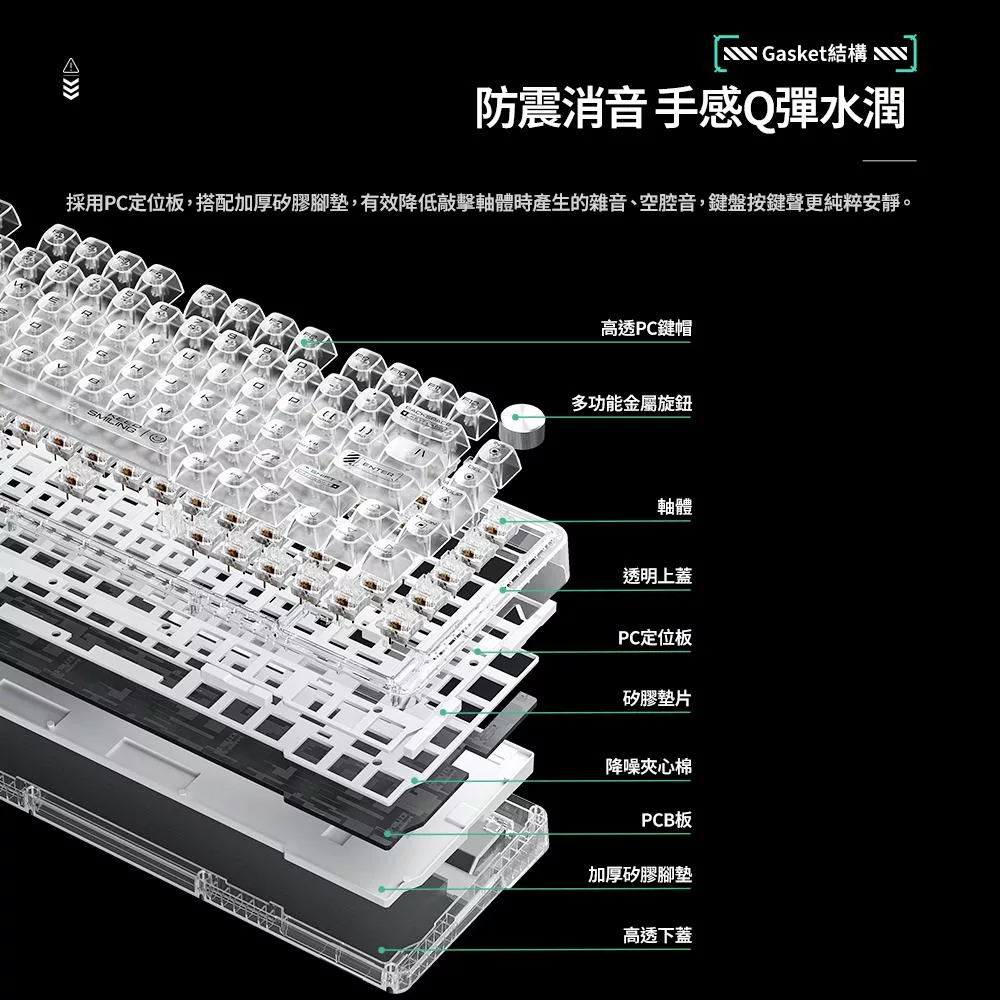 全晶透軸體透光更清晰,配合靜透軸音的冰瑩線性軸,聲音清澈耐聽。