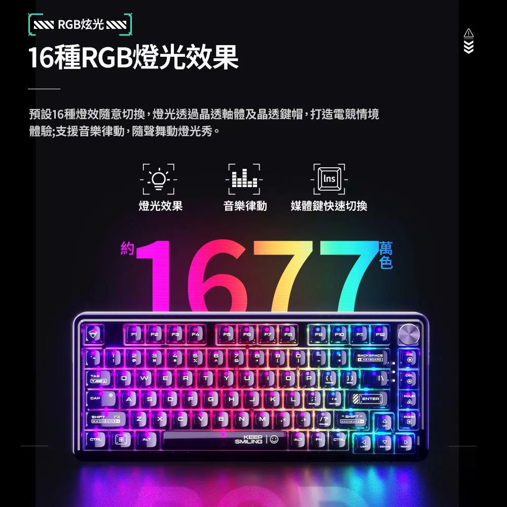 預設16種燈效隨意切換,燈光透過晶透軸體及晶透鍵帽,打造電競情境體驗;支援音樂律動,隨聲舞動燈光秀。