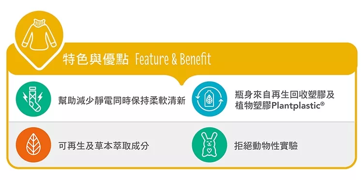 讓你忍不住想要擁抱衣物 For Clothes You'll Want To Cuddle 衣物柔軟蓬鬆,減少靜電產生 softens Clothes & Reduces Static 植物萃取的成份,柔軟衣物蓬鬆好熨燙,完全可以生物分解,不影響水源,反對動物測試,自然蓬鬆柔軟,衣物更清新;熨燙平整衣物更容易,無石化成 份,清新香氛,植萃成份、無色素,愛護你的肌膚。