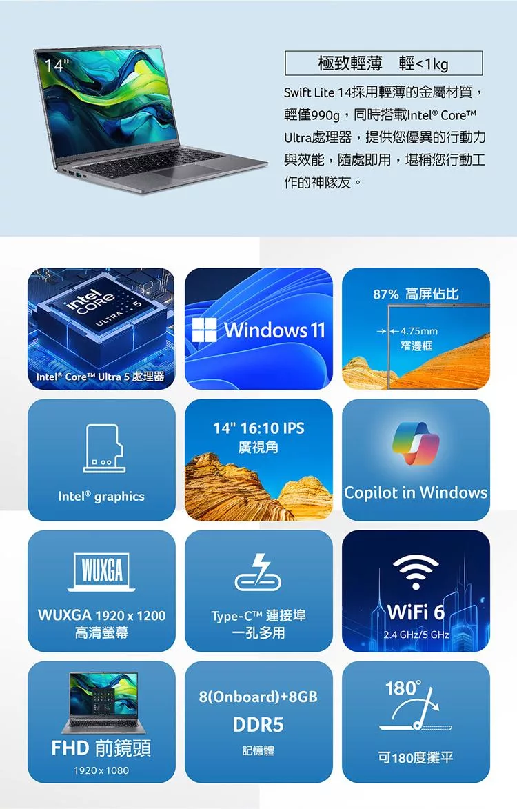 ★硬碟升級★ ACER 宏碁 Swift Lite 14 SFL14-51M-50W8 14吋 筆電 特仕版 (CU5-125U/8+8G/直升1TB/W11)