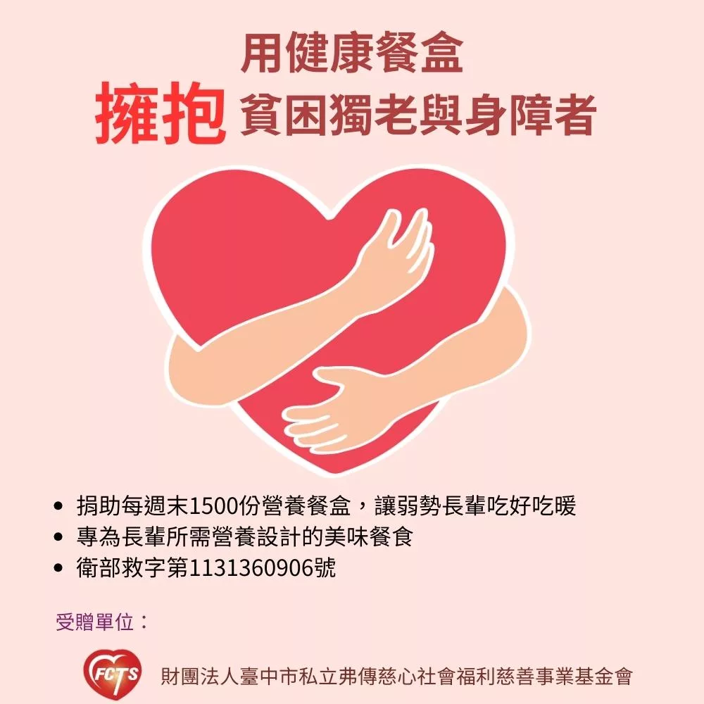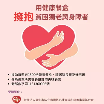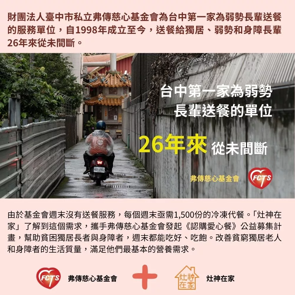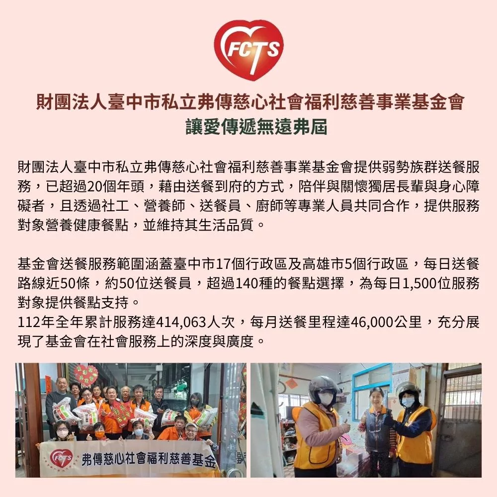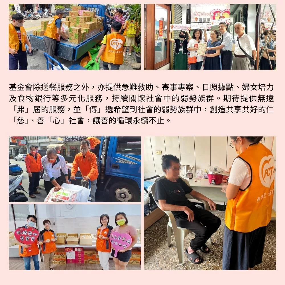 財團法人臺中市私立弗傳慈心社會福利慈善事業基金會提供弱勢族群送餐服務,已超過20個年頭,藉由送餐到府的方式,陪伴與關懷獨居長輩與身心障礙者,且透過社工、營養師、送餐員、廚師等專業人員共同合作,提供服務對象營養健康餐點,並維持其生活品質。