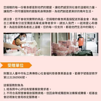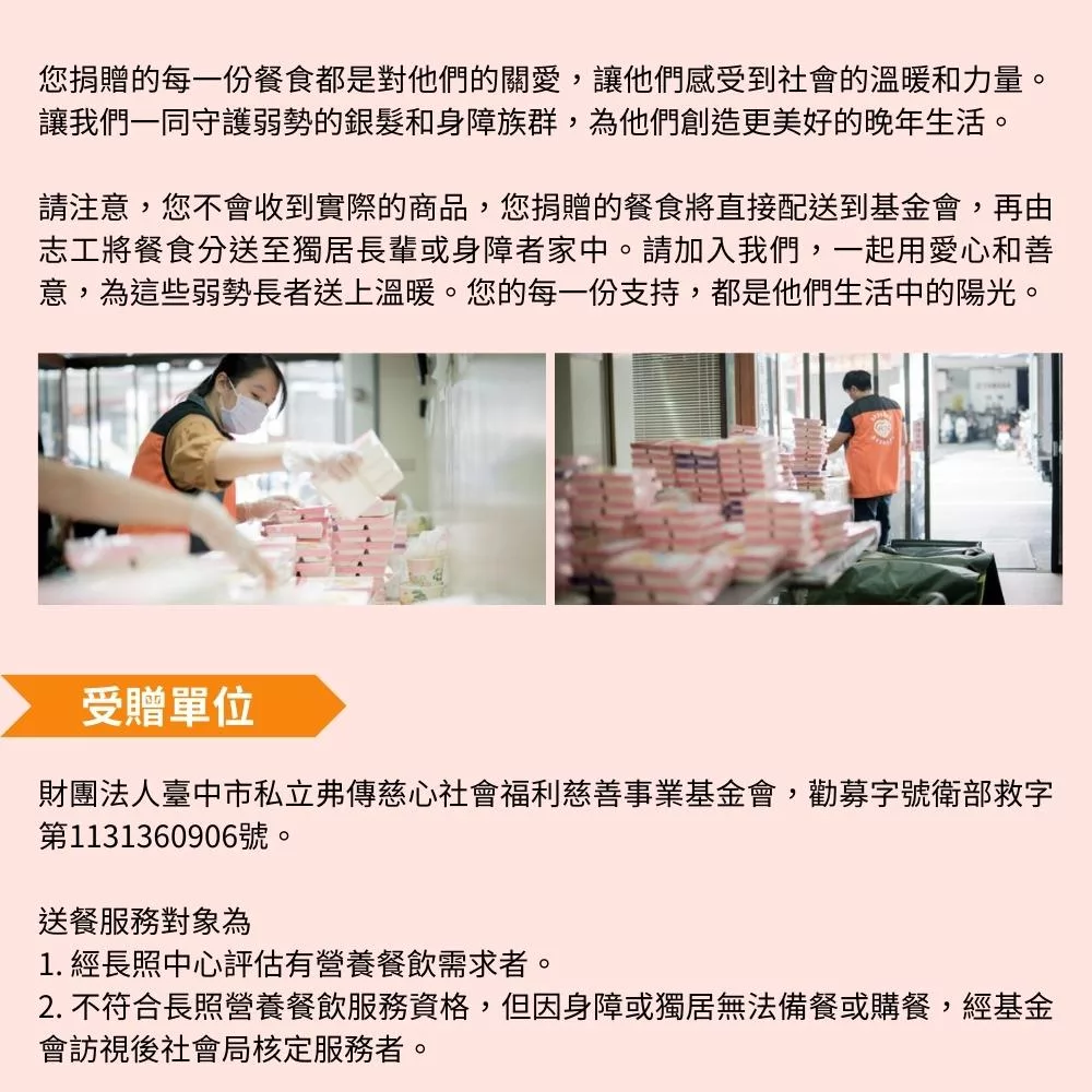 請注意,您不會收到實際的商品,您捐贈的餐食將直接配送到基金會,再由志工將餐食分送至獨居長輩或身障者家中。請加入我們,一起用愛心和善意,為這些弱勢長者送上溫暖。您的每一份支持,都是他們生活中的陽光。