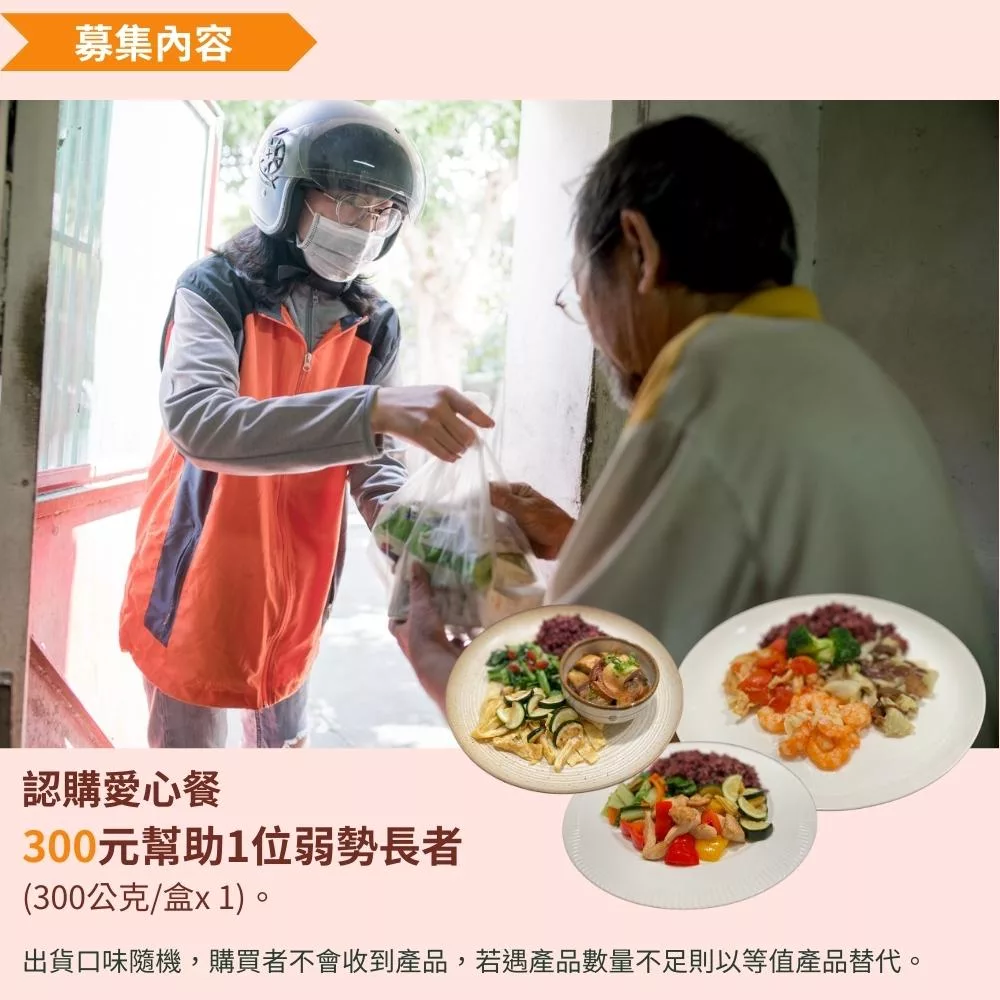 認購愛心餐300元幫助1位弱勢長者 (300公克/盒)。