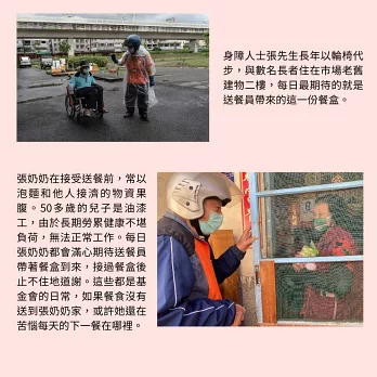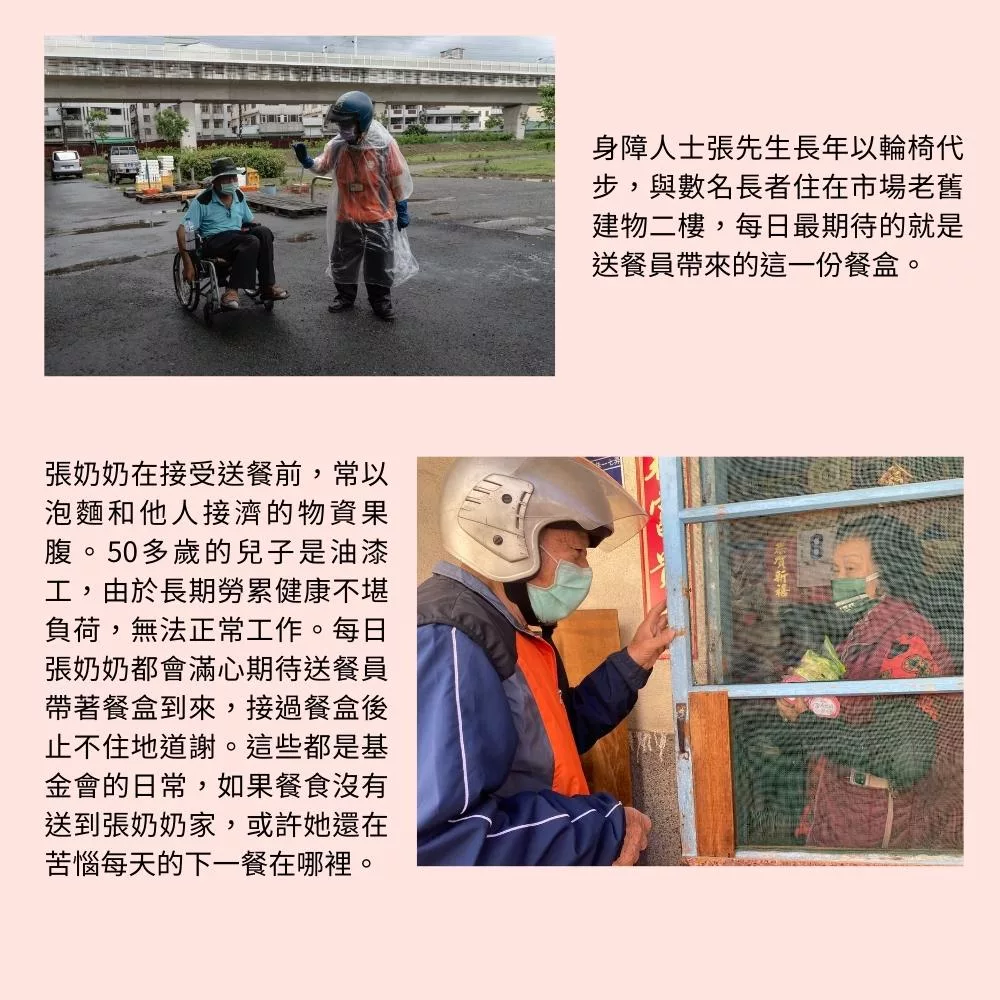 張奶奶在接受送餐前,常以泡麵和他人接濟的物資果腹。50多歲的兒子是油漆工,由於長期勞累健康不堪負荷,無法正常工作。每日張奶奶都會滿心期待送餐員帶著餐盒到來,接過餐盒後止不住地道謝。這些都是基金會的日常,如果餐食沒有送到張奶奶家,或許她還在苦惱著,每天的下一餐在哪裡。