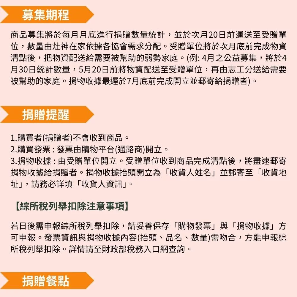 商品募集將於每月月底進行捐贈數量統計,並於次月20日前運送至受贈單位,數量由灶神在家依據各協會需求分配。受贈單位將於次月底前完成物資清點後,把物資配送給需要被幫助的弱勢家庭。(例: 4月之公益募集,將於4月30日統計數量,5月20日前將物資配送至受贈單位,再由志工分送給需要被幫助的家庭。捐物收據最遲於7月底前完成開立並郵寄給捐贈者)。