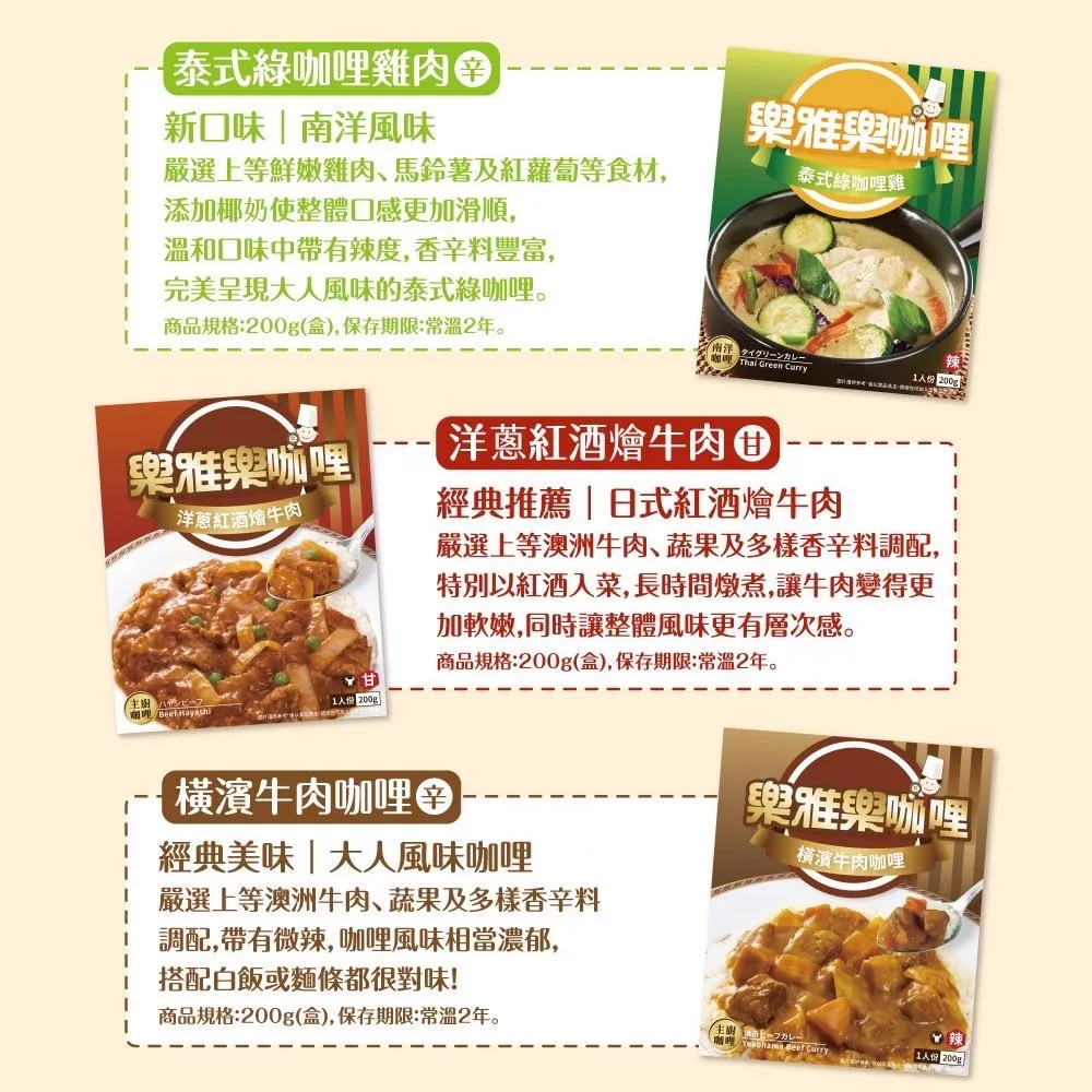 【摩斯嚴選】樂雅樂主廚咖哩系列(橫濱牛/泰式綠咖哩雞/洋蔥紅酒燴牛肉) 12包