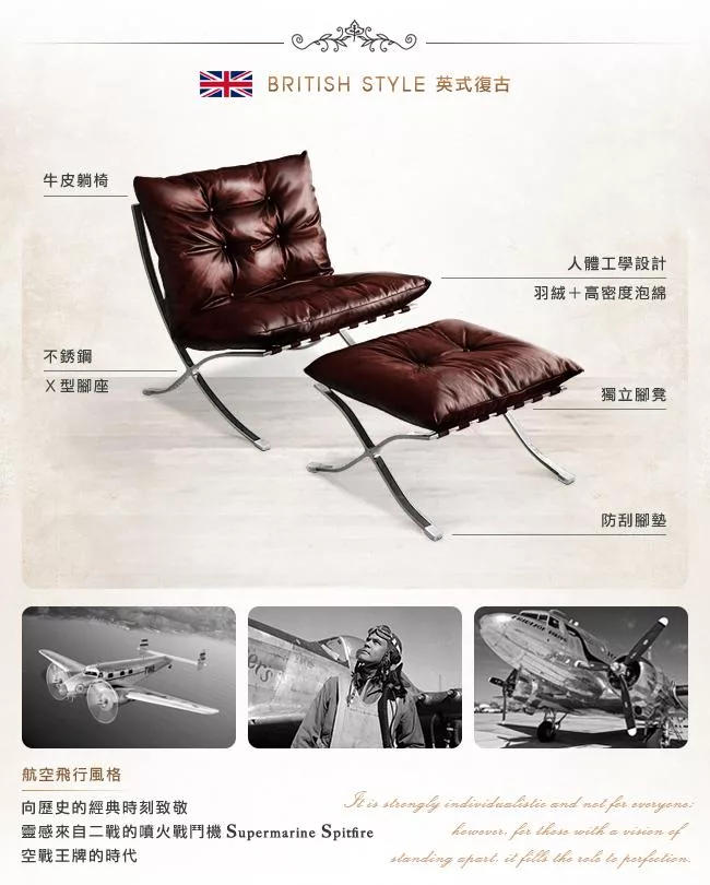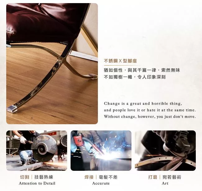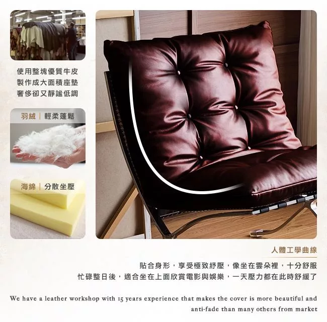 材質:巴西頭層牛皮、羽絨、高密度泡綿、高強度支撐帶、不銹鋼椅框