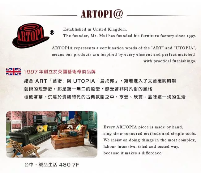 在對古董、復古傢俱的熱愛下,於 1997 年成立英國藝術傢俱品牌。結合「ART」藝術與「UTOPIA」烏托邦,宛若進入文藝復興時期,藝術的理想鄉。那是獨一無二的殿堂,感受著非同凡俗的風格。極致奢華,沈浸於貴族時代的古典氛圍之中,享受、欣賞、品味這一切的生活。每件 ARTOPI 的藝術品,採用最佳的傳統技藝,以及優良的材料製作而成。回顧百年歷史的靈感,融入現代時尚的美感,醞釀創意、重新構想,因而產生了獨特、與眾不同的收藏品,突破了傢俱設計的界線,成為了格調。