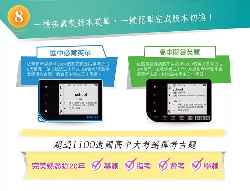 一機搭載雙版本英單與考古題,一鍵簡單完成版本切換,陪伴孩子國中到高中的成長學習,也滿足家長需求