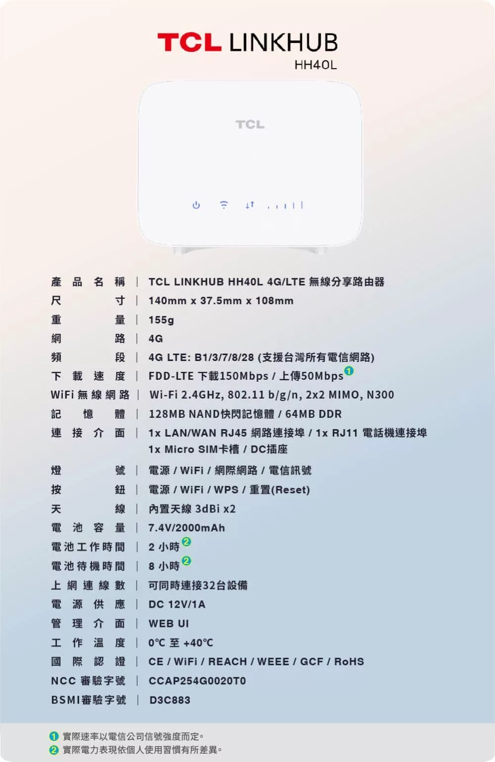 TCL LINKHUB HH40L 4G LTE 無線分享路由器