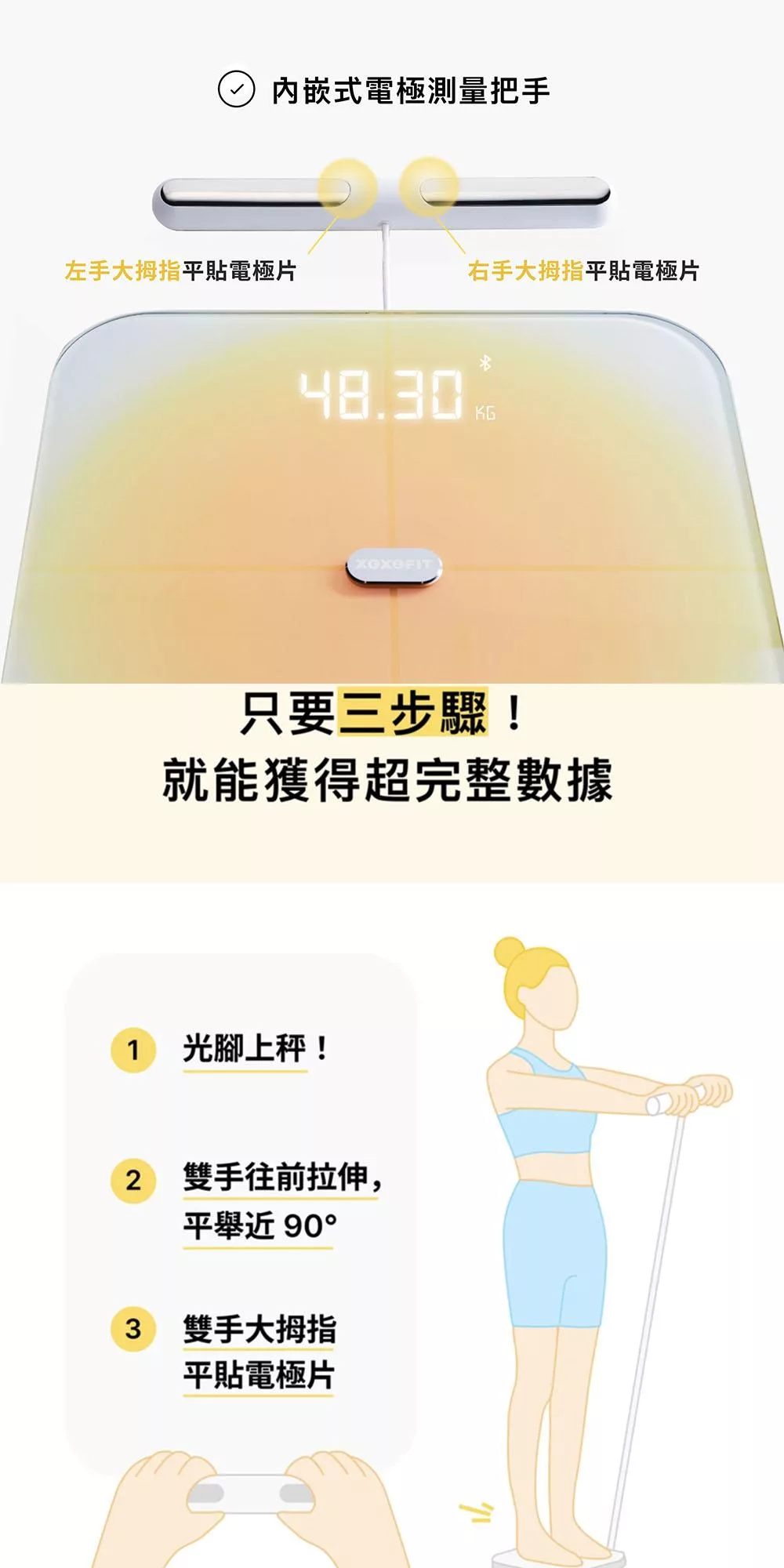 有別於市面其他八極體重計,需要準確踩在電極片上才能準確測量,XOFIT Pro 採用 ITO 鍍膜技術,隱藏突兀的銀色電極片,不用刻意瞄準位置,雙腳一踩、手一握、再一拉!就能快速獲得全方位的身體數據。