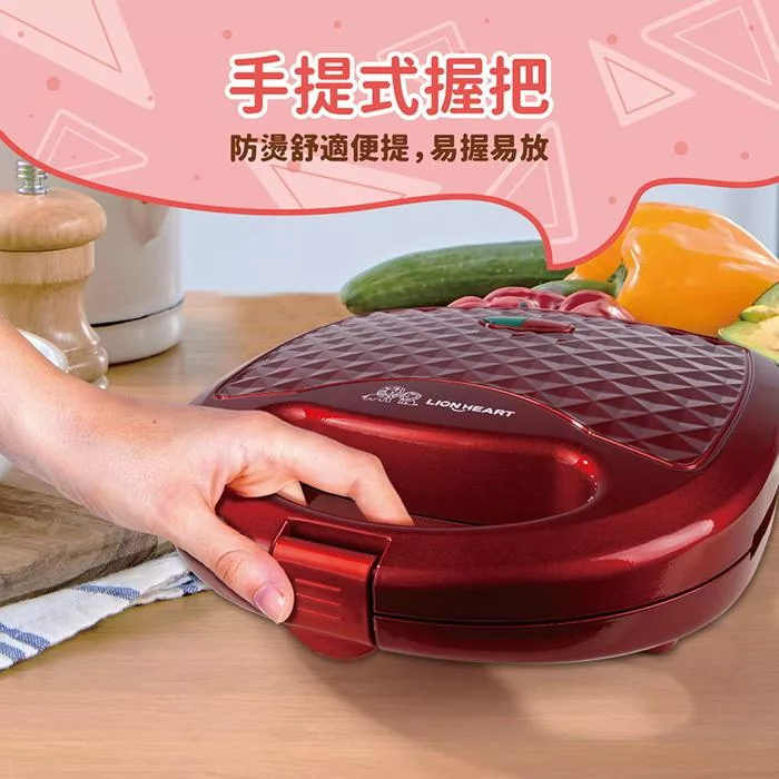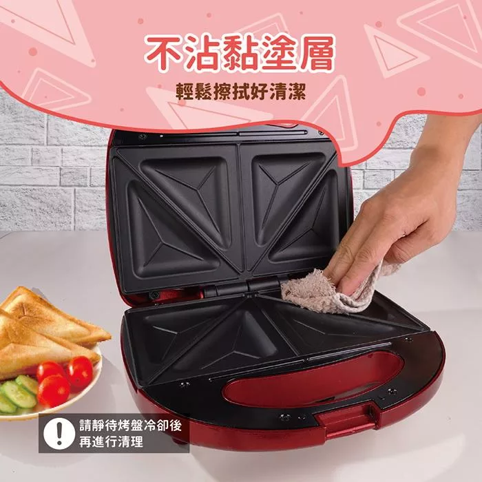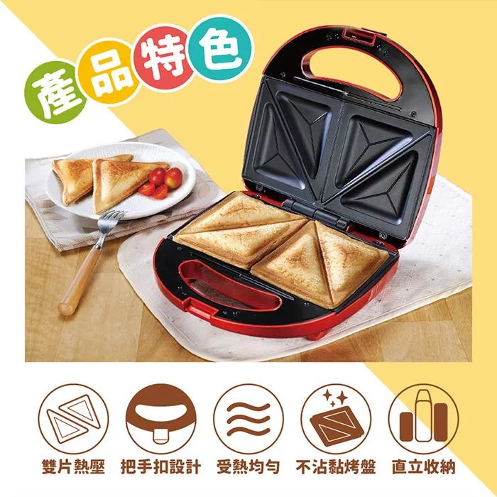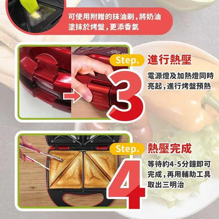 .扣緊握把扣,待烘烤完成,自動將吐司封壓成型即成4個三明治。
