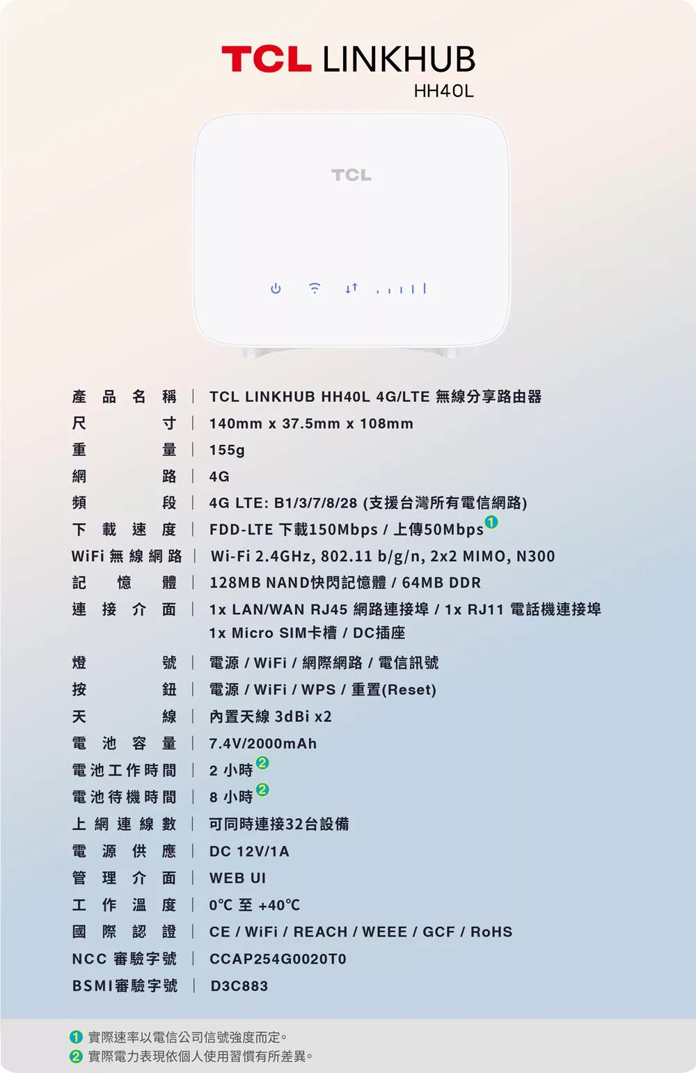 TCL LINKHUB HH40L 4G LTE 無線分享路由器