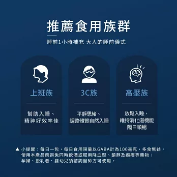 好睡優益生菌GABA含量為約為100毫克,每日限量一包,使用本產品應避免同時飲酒或服用血壓藥物、鎮靜及癲癇等藥物;孕婦、授乳者、嬰幼兒,須諮詢醫師方可使用。