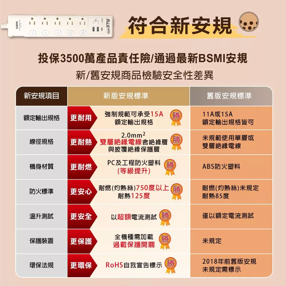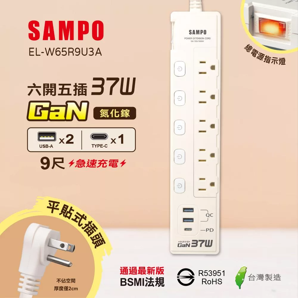 +886 [極野家] 5開5插1USB+2Type C PD 65W 快充延長線1.8米 V2 HPS2556 (3色可選) 奶茶棕