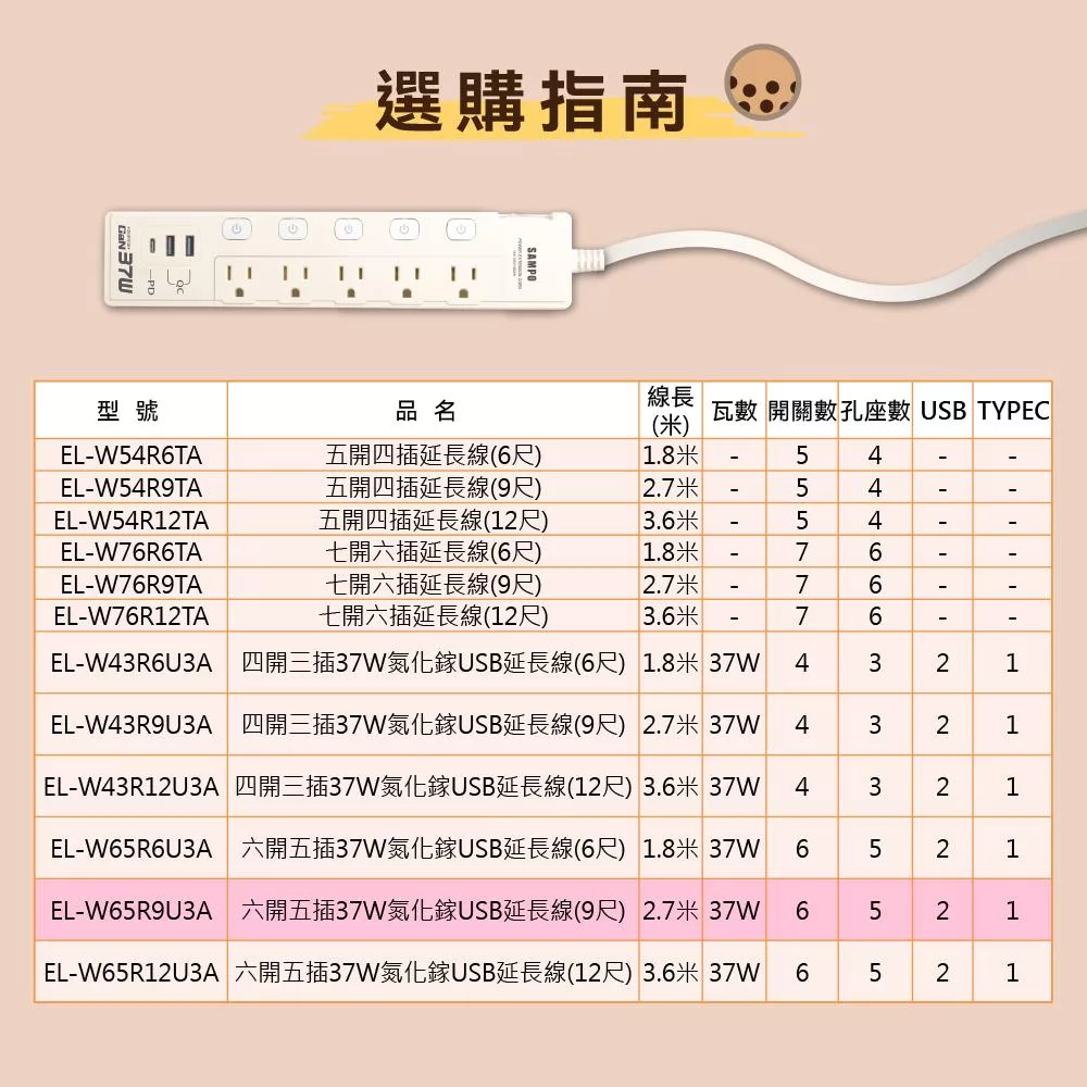 +886 [極野家] 3開3插1USB+2Type C PD 65W 快充延長線1.8米 V2 HPS2336 (3色可選) 奶茶棕
