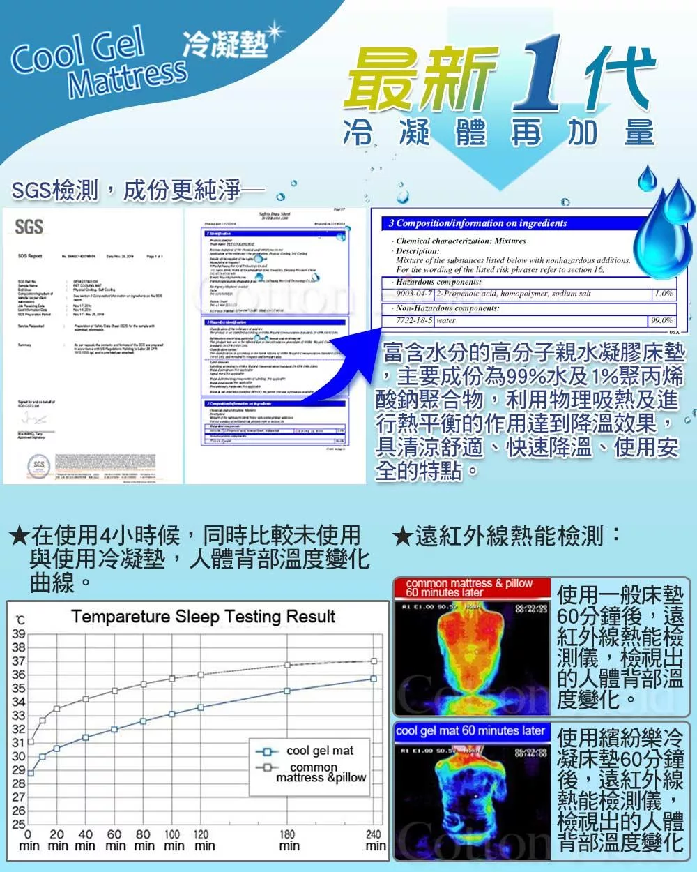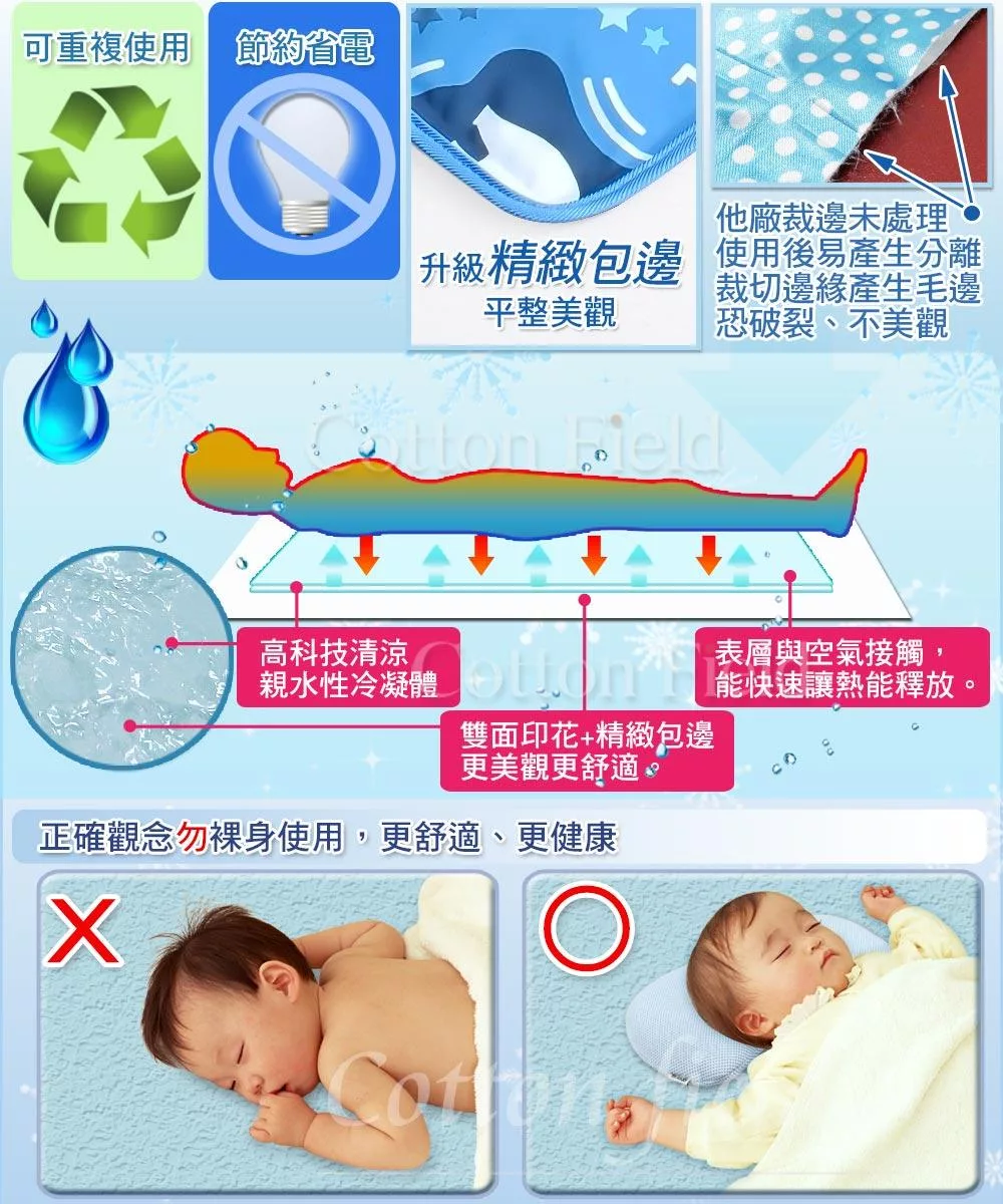 可是偏偏溫度屢創新高,不開冷氣真的就快要人間蒸發了,如何能夠減少使用能源,又不會讓自己受苦難熬,館長發現了一項新科技產品,經過不變改良,全新一代高吸水力高分子冷凝墊,清涼效果好,吸熱散熱性物理原理,對人體的吸熱作用良好,涼感效果大提升,真正使用您會感覺到。
