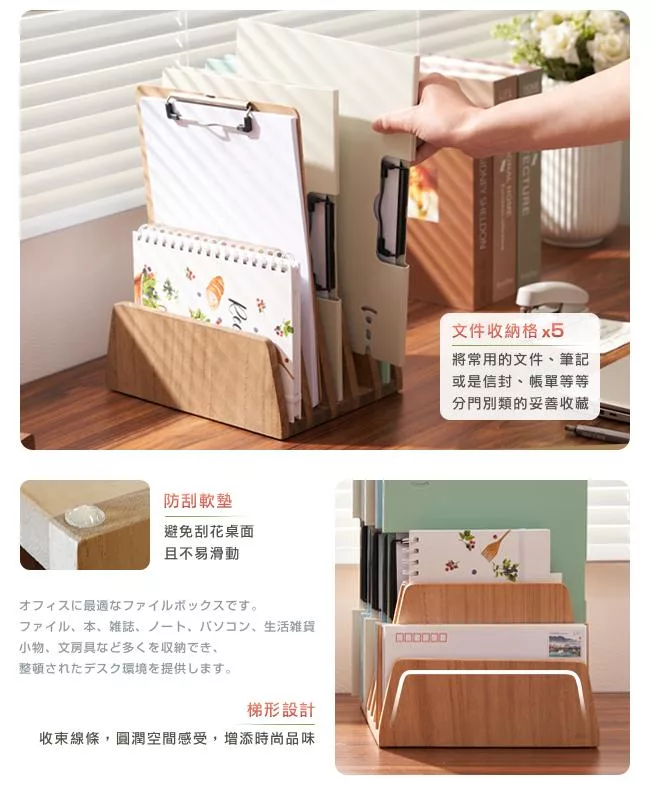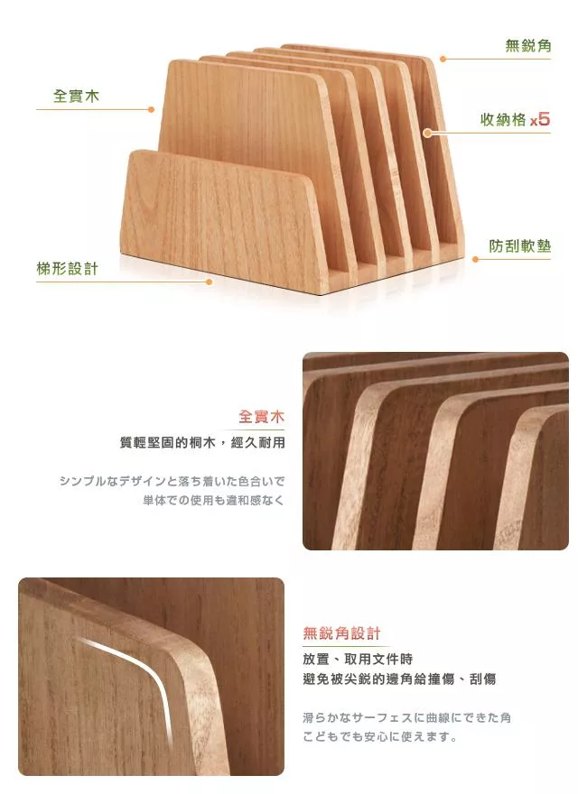 為生活的幸福感而設計,愛上收納就從現在開始。環保植物染不用化學物質,以天然植物油與蠟為基料,滲透進桐木內形成保護層,增添天然木的質感。在桌上專注工作、作業時,取用各種資料,不用再擺滿整個桌面。一個簡約的實木文件夾,將常用的資料夾、文件、筆記,或是信封、帳單等等,分門別類的妥善收藏好。一個收納的小改變,除了讓桌面變得整齊外,做事情也將更有效率。無銳角在放置、取用文件時,不用擔心被尖銳的邊角給撞傷、刮傷。梯形設計收束線條,圓潤空間的感受,增添時尚品味。防刮軟墊避免刮花桌面,且不易滑動。