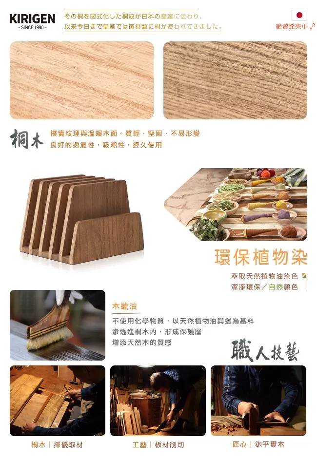 桐木質輕且不透濕氣,少分叉與歪斜,其木質特色特別適合台灣海島型潮濕氣候。特性重量輕、吸潮、透氣性好、不易變形、結構穩定性強、顏色好看。木材紋理通直,刨光後有絹絲光澤。桐木有很好的象徵意義,象徵富貴,被認為是高級木材之瑰寶。自古以來,是日本皇室御用的傢俱,尊貴不凡,而今依舊如此。
